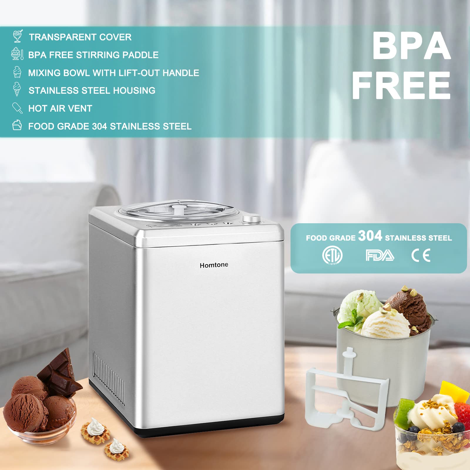 - 【Safe to Use】:Homtone Ice Cream Maker's stainless steel bowl and mixing blades are BPA-free for safe food contact. Homtone Compressor Ice Cream Maker has an extended 2-hour keep-cool time to prevent ice cream from melting and motor protection to prevent overheating and damage.