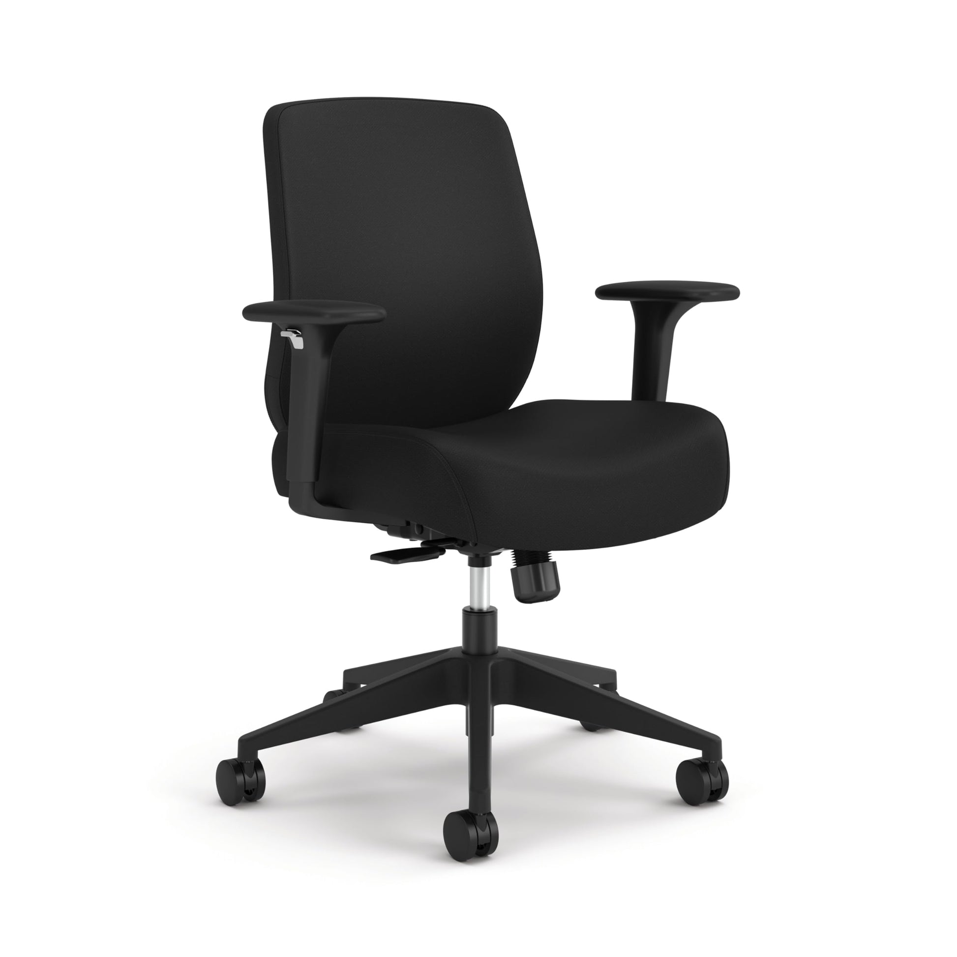 Details: The HON Altern ergonomic office chair is designed to meet the needs of today's workspaces. Featuring an extra thick foam cushion (3.5'), this office chair with wheels offers great customization for your comfort. Whether you're looking for a rolling office chair or a comfortable desk chair, this task chair provides great support. With its ergonomic design, this office chair's advanced synchro-tilt mechanism ensures you stay comfortable throughout the day. The upholstered back of this fabric office chair includes a flexible core and padding for comfort without bulk.The desk chair features seat slide, allowing you to adjust forward or backward to encourage proper back support, posture and weight distribution no matter your height. This comfortable computer chair allows for easy maneuverability thanks to its 360-degree swivel caster wheels, making it a great rolling office chair for any floor type. With a durable 5-star base, this modern office chair supports up to 300 lbs. The black desk chair adapts to various body heights with its pneumatic seat adjustment.The ergonomic chair features height-adjustable arms for shoulder and forearms support. With quiet all-surface casters, this office task chair moves effortlessly, and the tilt tension and lock controls help you find your preferred recline. This back support office chair delivers all-day comfort with its upholstered low back and fully adjustable features. Versatile enough for business, remote work, or education, the HON Altern task chair fits seamlessly into any environment, providing comfortable and stylish seating.