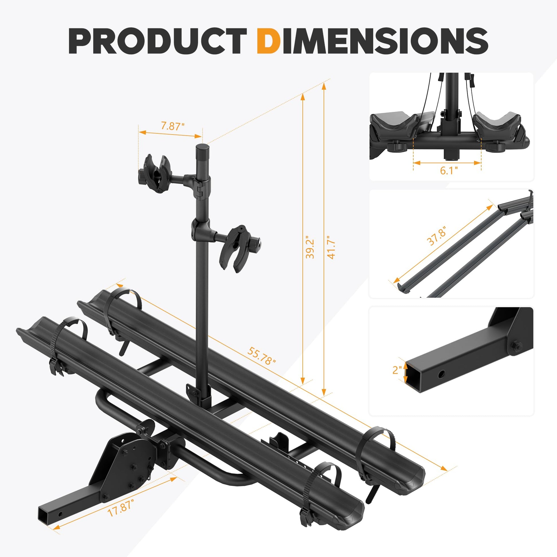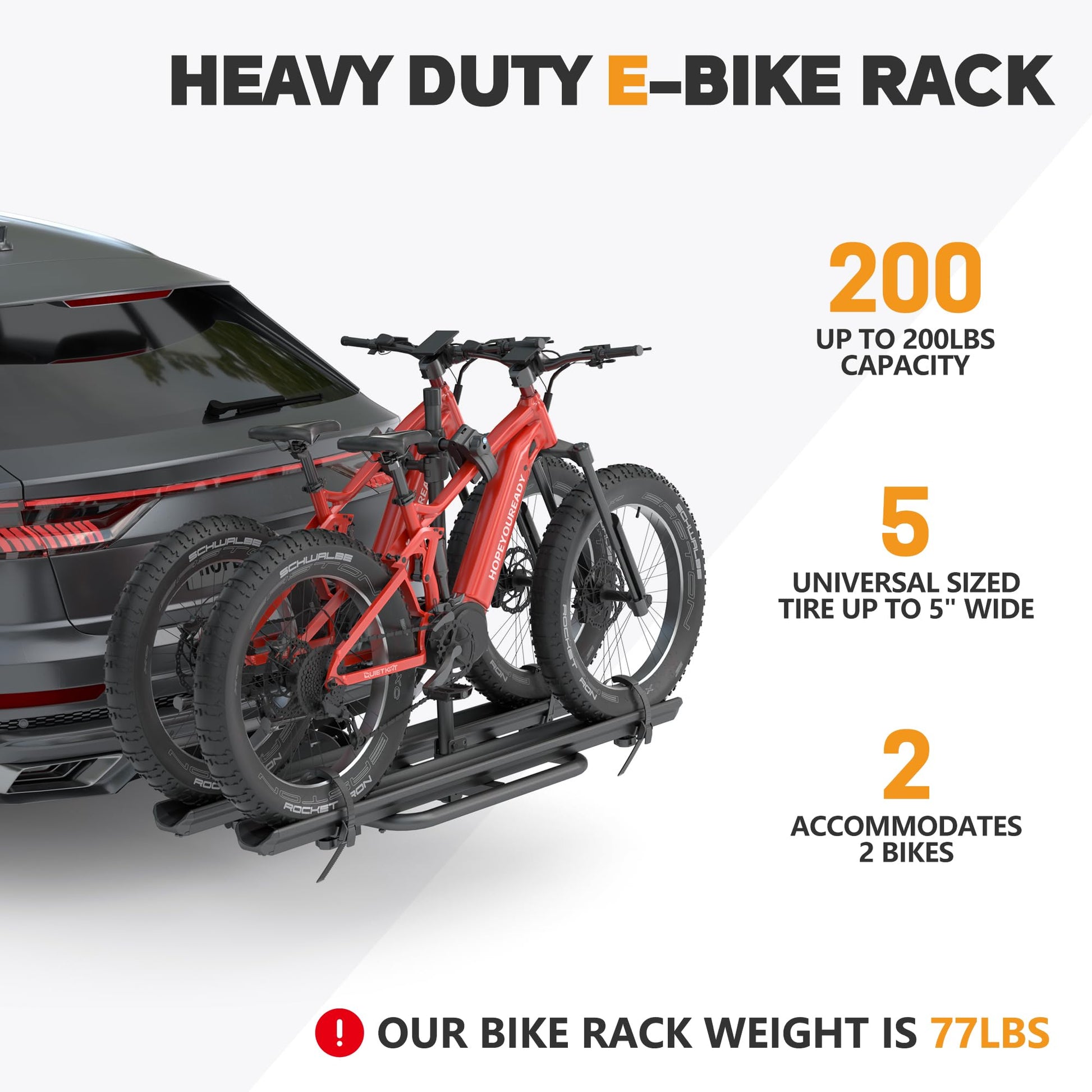 - Superior Materials: Our 2 ebike racks is made of heavy-duty steel and aluminum with a corrosion-resistant e-coat finish, this e-bike rack platform features long-lasting durability. It can accommodate 2 bikes up to 200 lbs capacity.