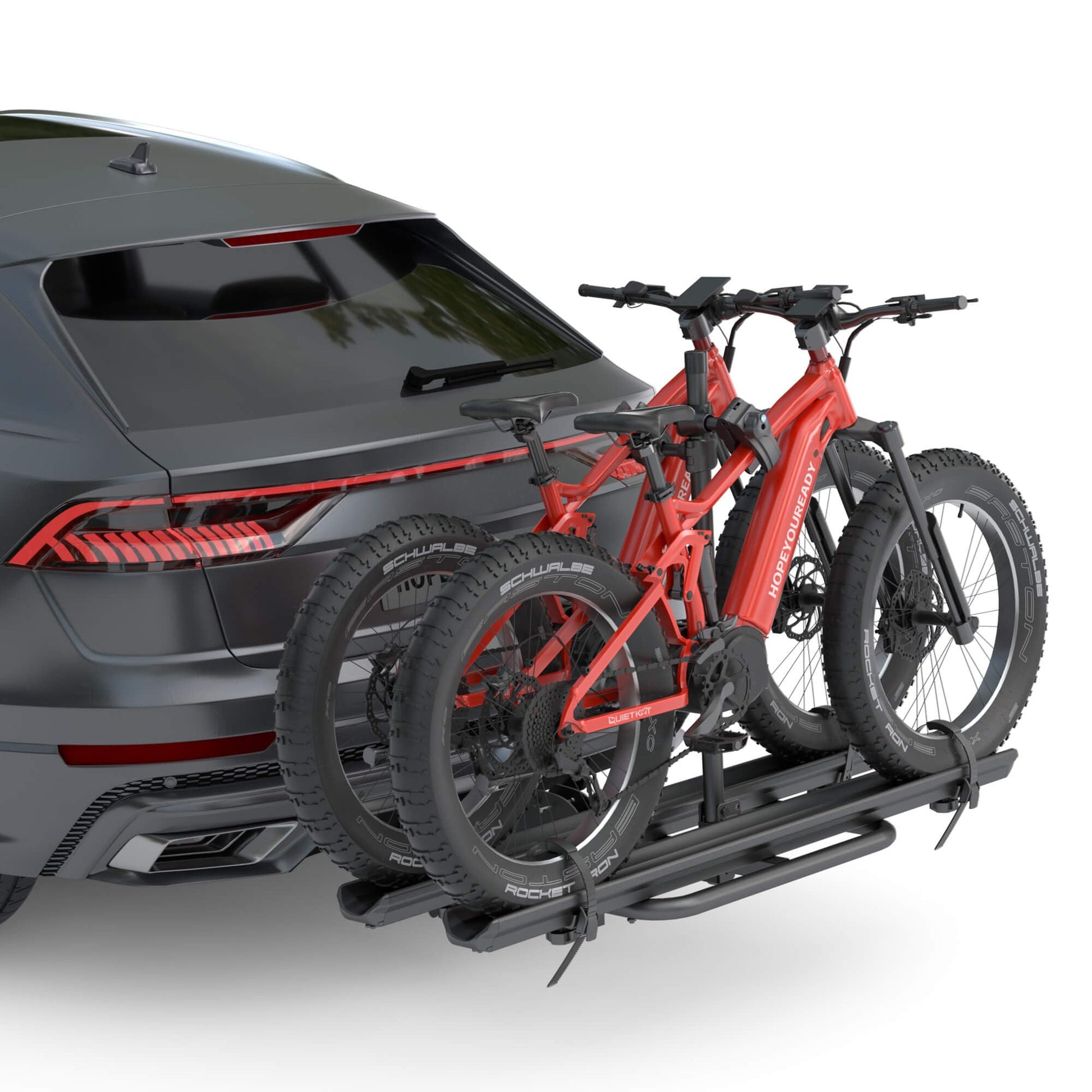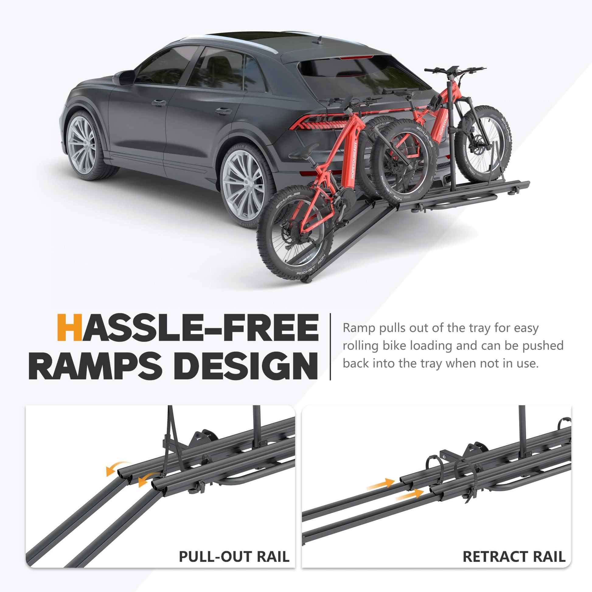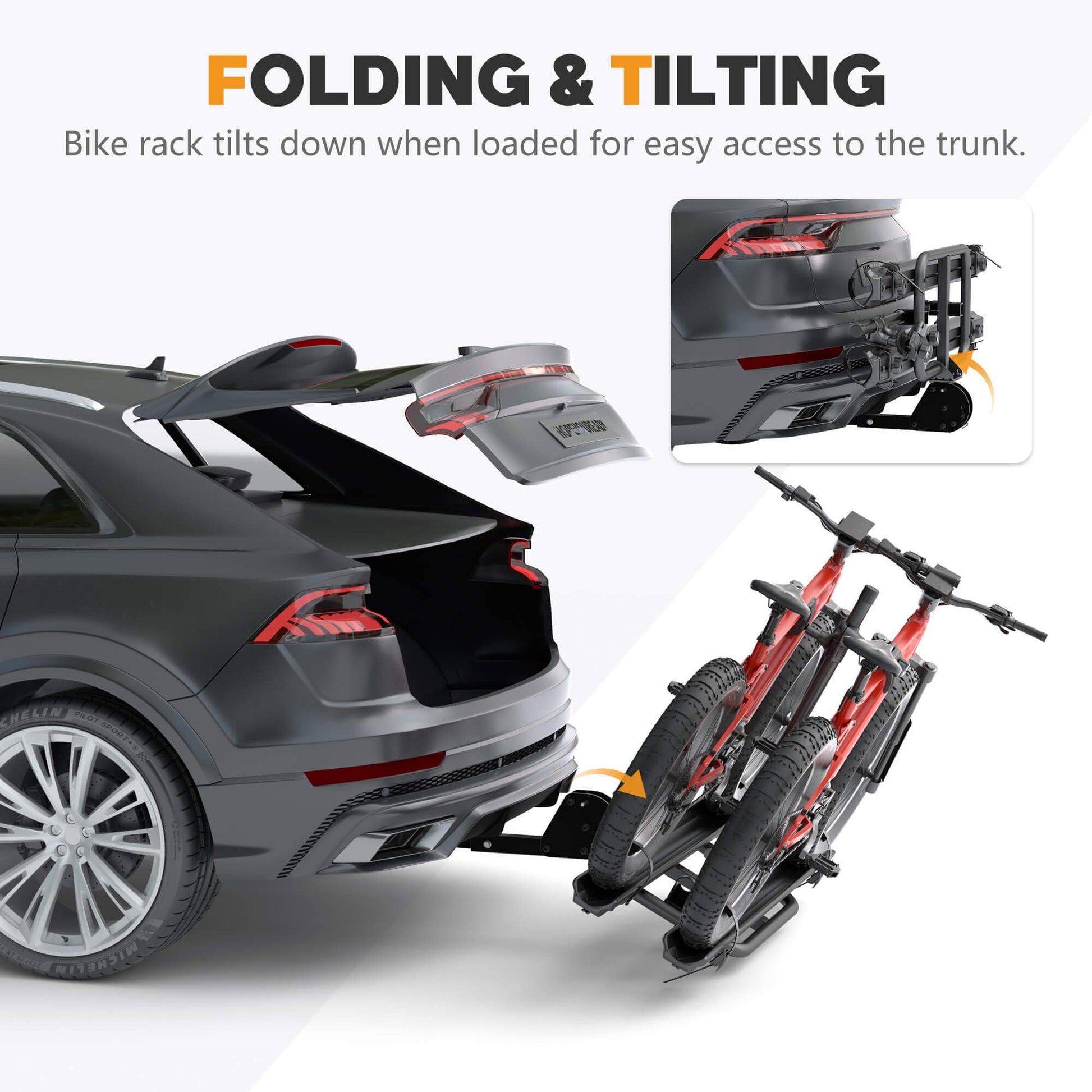 - Folding Design: This electric bike rack with ramp hitch mounted bicycle bike rack platform features a downward sloping design that tilts downward after you load the bike to access the trunk. The 2-inch hitch mounted fat tire bike rack mounts easily to the 2-inch trailer receiver, but 4x4s with rear-mounted spare tires require an extended trailer receiver. Tilting and foldable heavy duty ebike rack for car, suv, rv and truck.