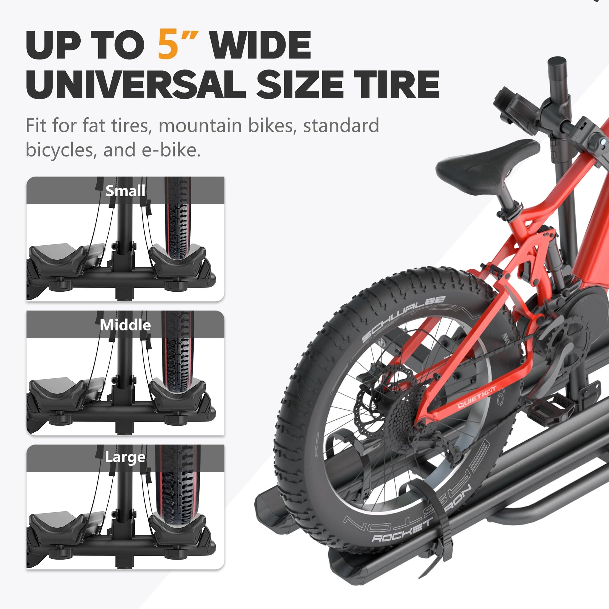 - Up to 3-5'' Fat Tire: The heavy duty electric bike rack for car accommodates tires up to 5 inches wide. Our e-bike racks can securely carry e-bikes, mountain bikes, road bikes, children's bikes, standard, fat tire, electric bicycles and BMX bikes.