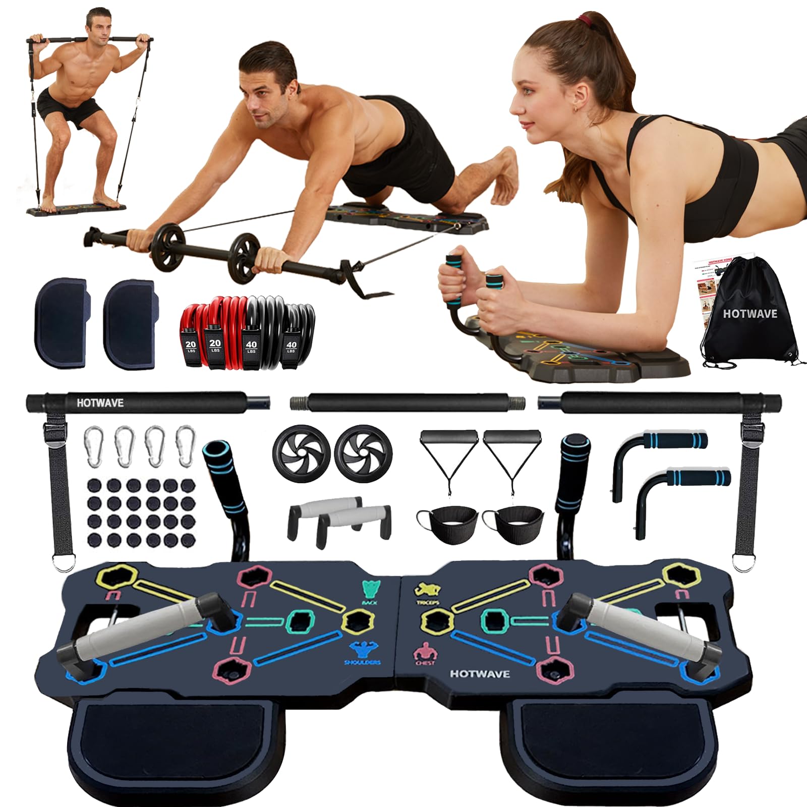 - 【ULTIMATE HOME WORKOUT EQUIPMENT】The newly upgraded hotwave portable fitness device is more efficient and stable. You can freely assemble accessories to complete the training:foldable Pushup board&Plank,Unique 3-section Bar,4 Strong resistance bands, 2Ankle Strap,door nachor,Ab roller wheel,Can complete more than 50 different exercises,Help you exercise whenever you want,just like at the gym.