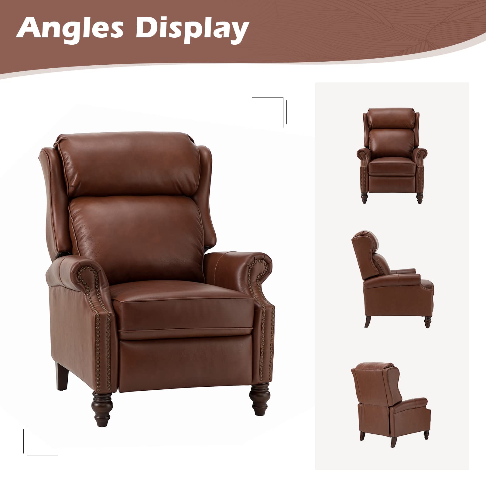 HULALA HOME Genuine Leather Recliner Chair, Traditional Manual Pushback Comfy Seating for Living Room, Thick Cushion & Solid Wood Legs, Wingback Recliner with Nailhead Trim, Brown