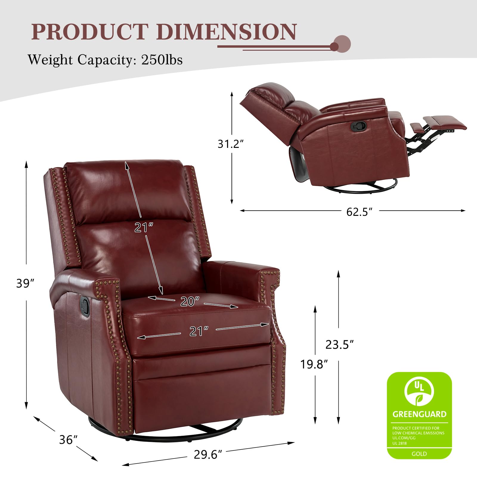 HULALA HOME Genuine Leather Swivel Rocker Recliner Chair Set of 2 for Living Room,Manual Glider Recliner with Adjustable Backrest&Footrest,Modern Home Theater Sofa Armchair with Nailhead Trim,BURGUNDY