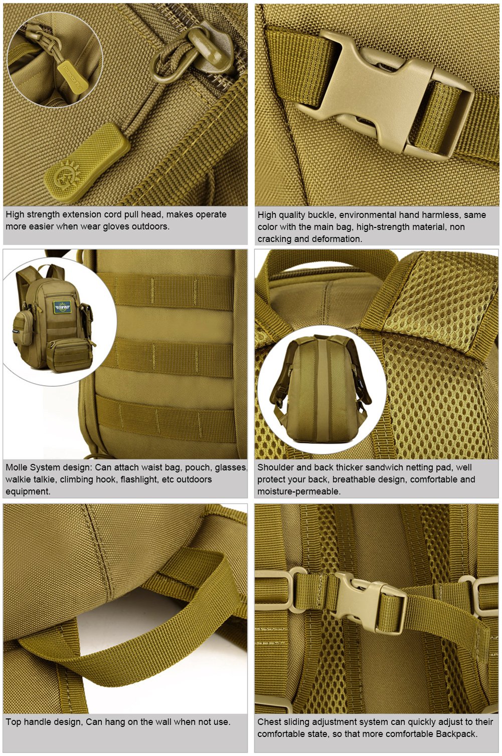 3.MOLLE external expansion system designed to be used in combination with other equipment,you can load pockets, water bottle bag, accessory kits and other.