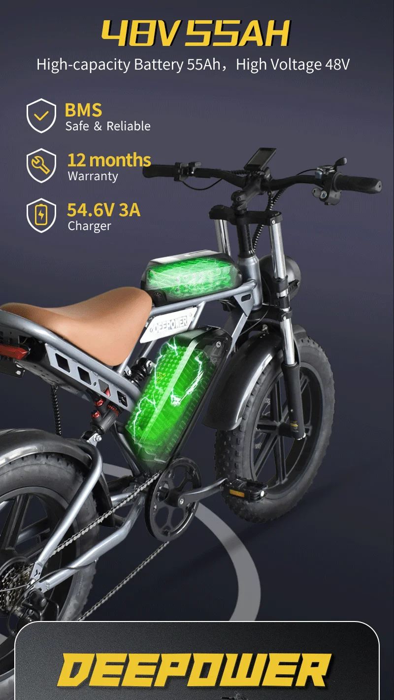 Introducing the IDOTATA-Moped Fat Tire Electric Bike for Adults. With powerful 2000W motor, 20 inch tires, and dual 48V 55Ah batteries, this ebike delivers a top speed of 35MPH and a range of 100 miles. Ideal for commuting or off-road adventures, experience the ultimate in electric biking technology.