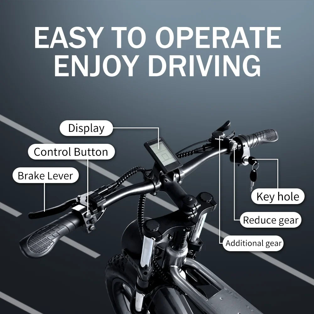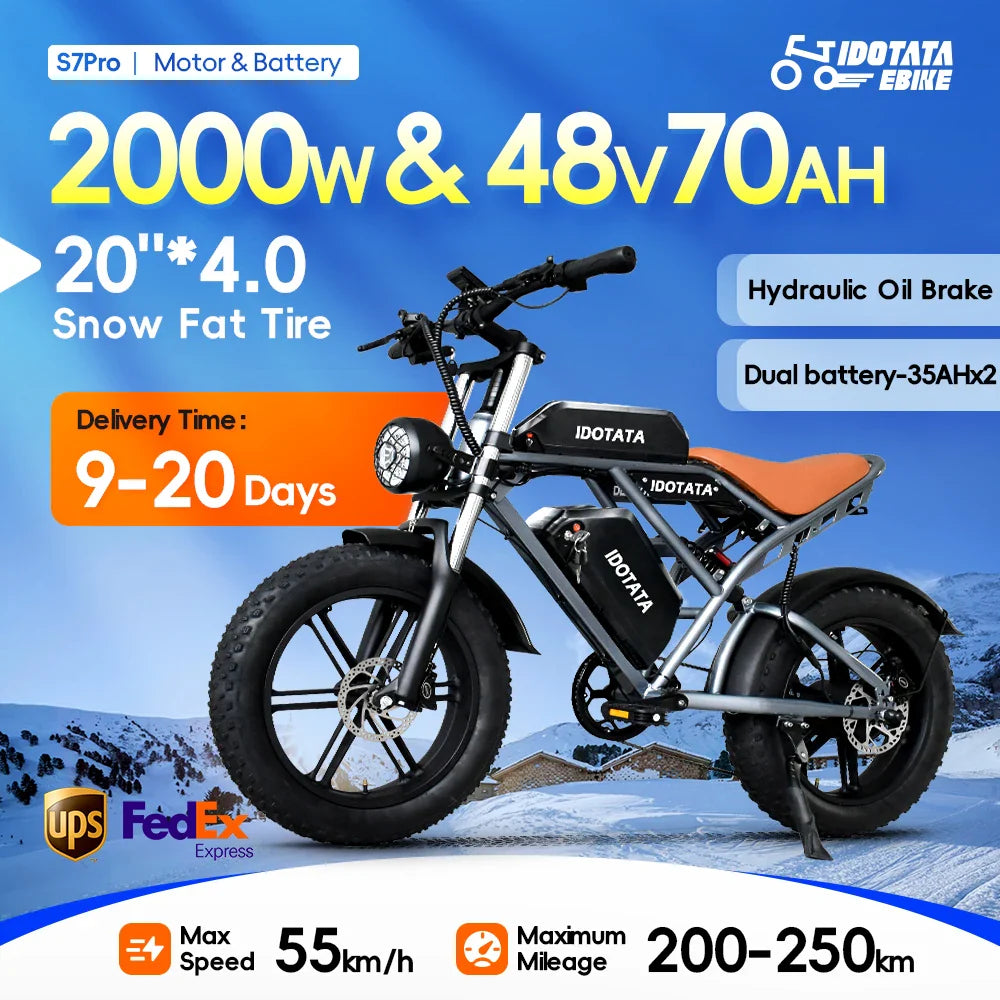 Meet the IDOTATA-S7 Electric Bike for Adults. With its powerful 2000W motor and 48V 70Ah dual battery, this e-bike offers a smooth and efficient ride. Its 20-inch, 4.0 fat tires make it perfect for all terrains, from snow-covered mountains to city streets. Experience the ultimate in convenience and power with this electric bicycle.