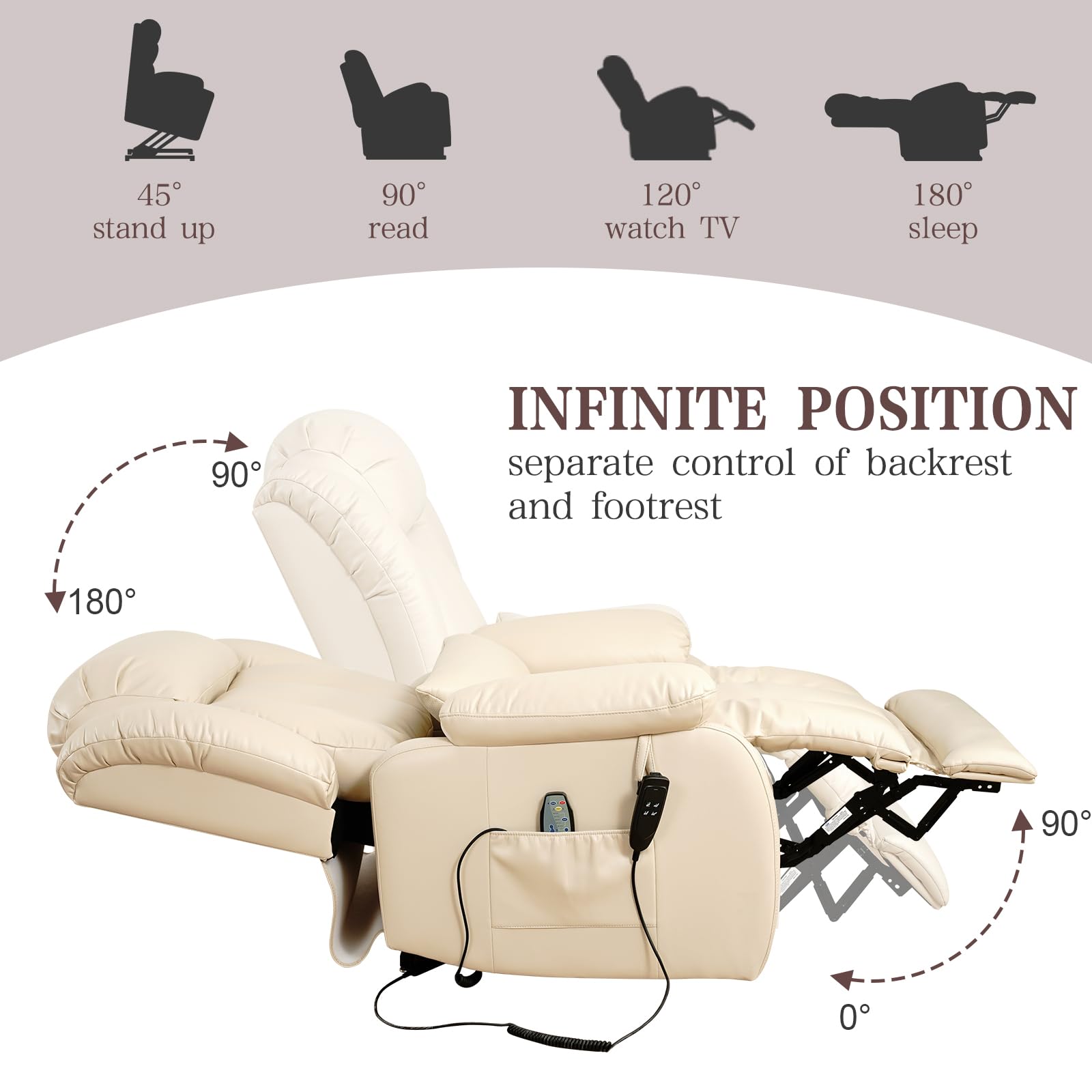 - 【Infinite Position Recline】This infinite position lift chair lets you recline the backrest and footrest independently between 90 and 180 degrees, allowing you to fully stretch and relax. Whether you’re reading, watching TV, or lounging flat like in a bed, this recliner supports any position. The extended footrest provides more comfort and space, making it perfect for those seeking a recliner chair for elderly or recliner with adjustable footrest