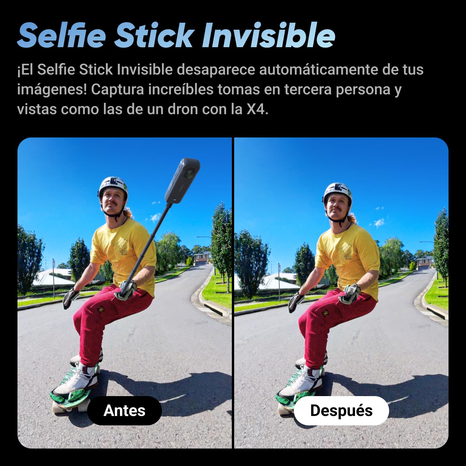- INVISIBLE SELFIE STICK - The signature third-person Insta360 shot, a specialty of 360 cameras. Immerse your viewers in obstruction-free 360° video, just like you're using a drone or as if you have your own film crew.