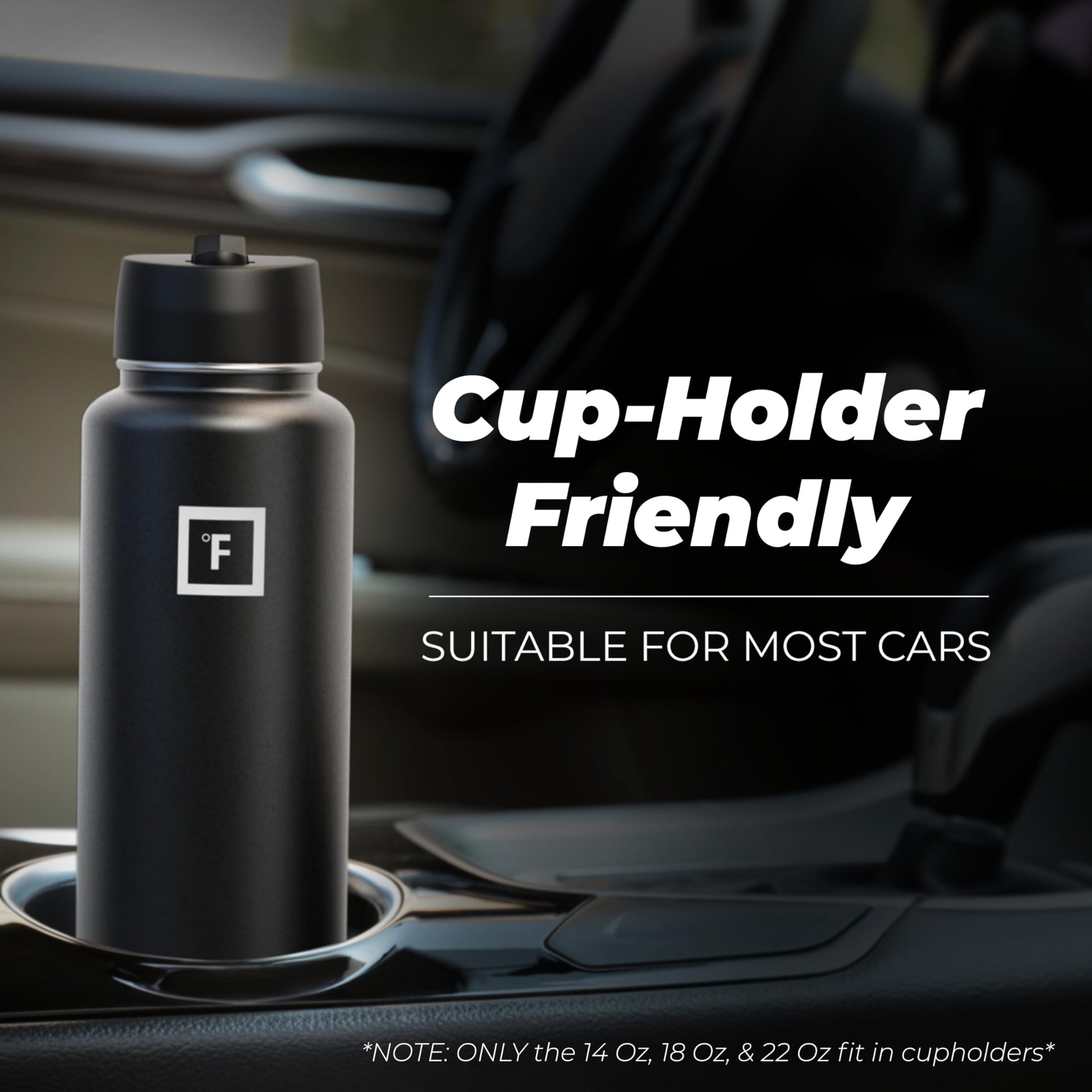 - INSULATED SPORTS WATER BOTTLE: Goodbye sweat! The double wall insulation makes the Iron Flask sweat-free! It keeps your drink COLD for up to 24 hours, and HOT for up to 12 hours. *NOTE: ONLY the 14 Oz, 18 Oz, & 22 Oz fit in cupholders*