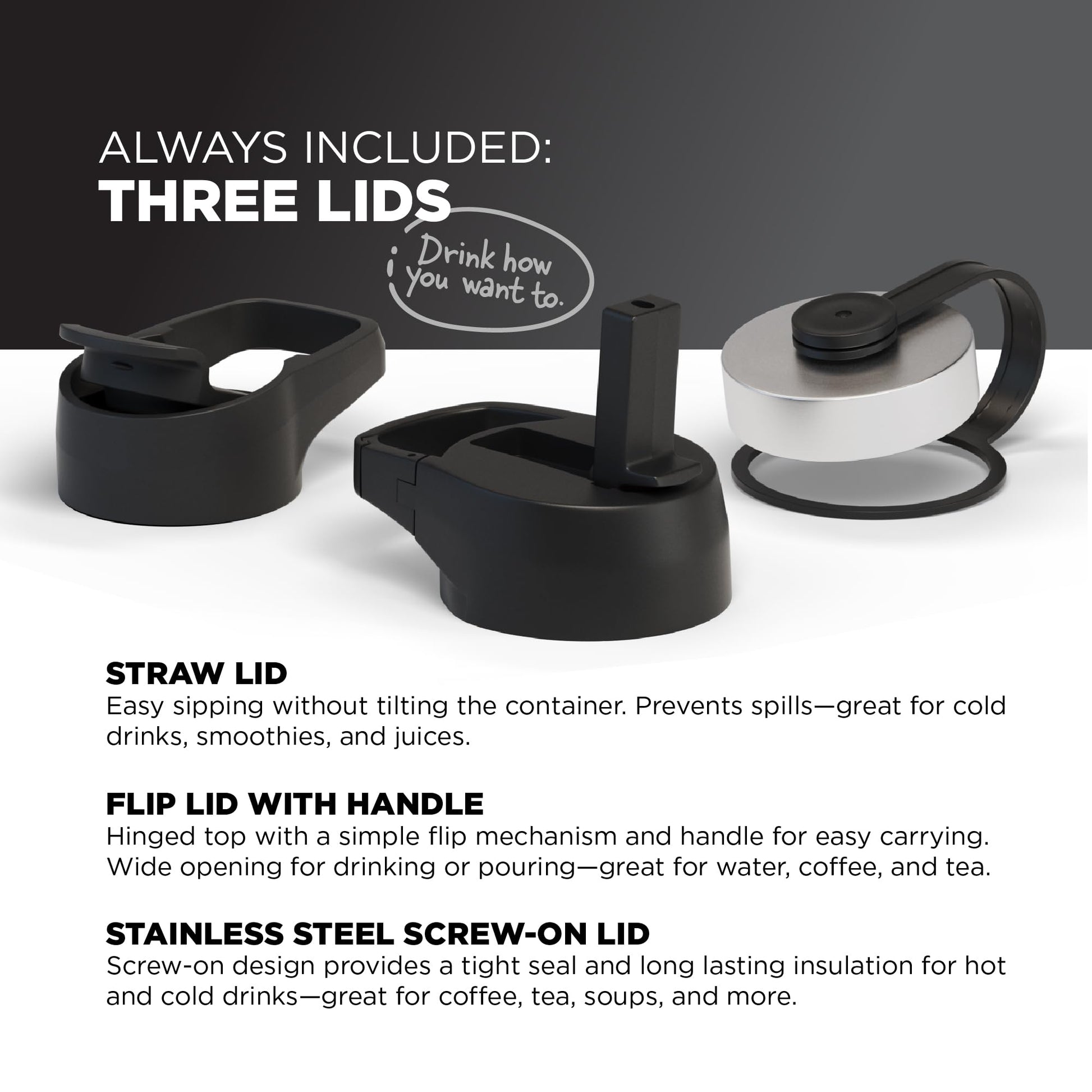 We all tried bottles that sweat and leak! Well, try the IRON FLASK that comes with THREE, YES THREE different lids (Sports Straw Lid with TWO different straws, Flip Lid, and a Stainless Steel Lid)