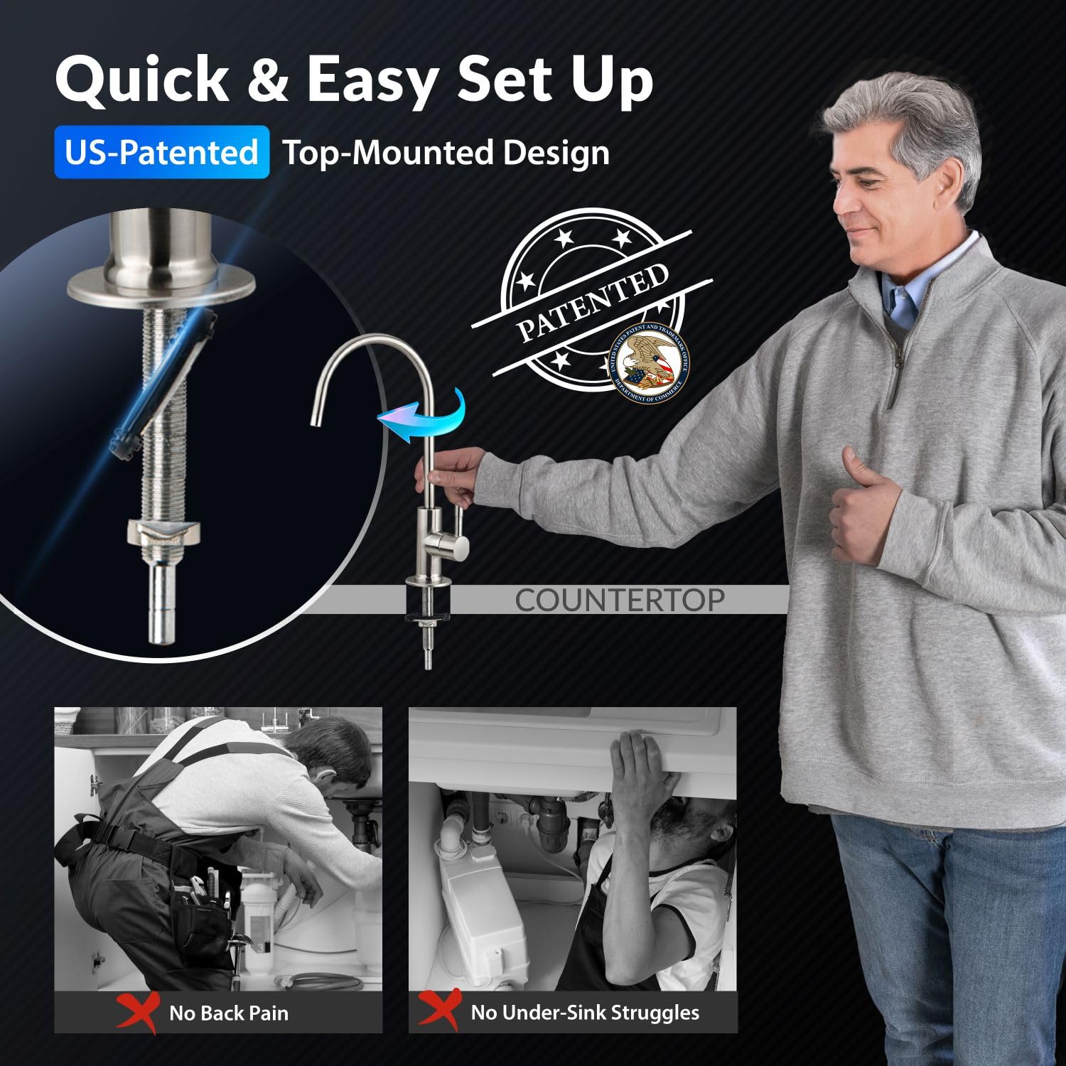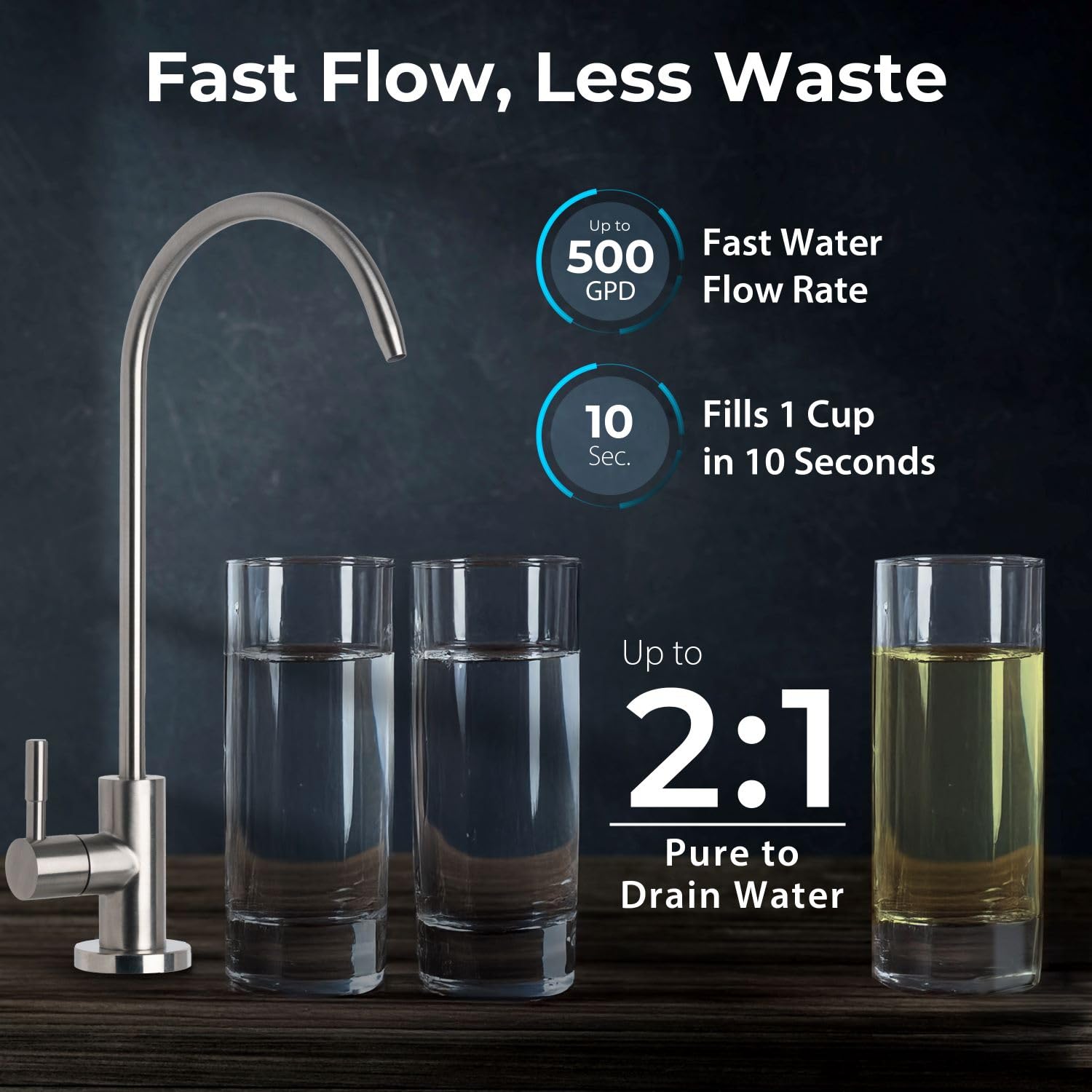 - 500 GPD High Flow Rate: The water filter reverse osmosis provides 500 gallons per day, more than 5x the flow of traditional RO systems. It can fill a cup in just 10 seconds, ensuring a continuous clean water supply for drinking and cooking.