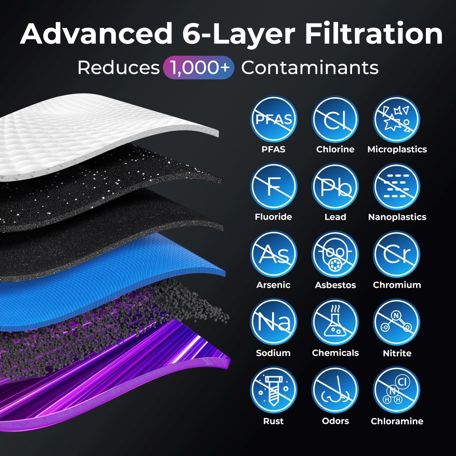 - 6-Layer Filtration with UV Protection: This reverse osmosis water filter features an advanced 6-layer filtration system, including a PP sediment filter, anti-scale filter, CTO, 0.0001-micron RO membrane, taste-polishing CTO filter, and a built-in UV light that lasts up to 8,000 working hours. The water filter for sink also includes a status indicator to monitor UV function, ensuring safe and clean water.