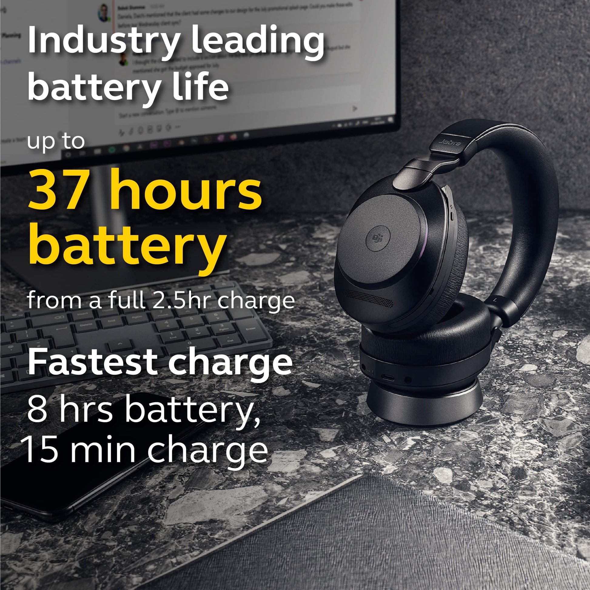 - INDUSTRY-LEADING BATTERY LIFE – The Jabra Evolve2 85 telework headset provides up to 37 hours of battery life on a single charge. With a charging stand included, it’s a wireless headset that’s designed to help you power through your week