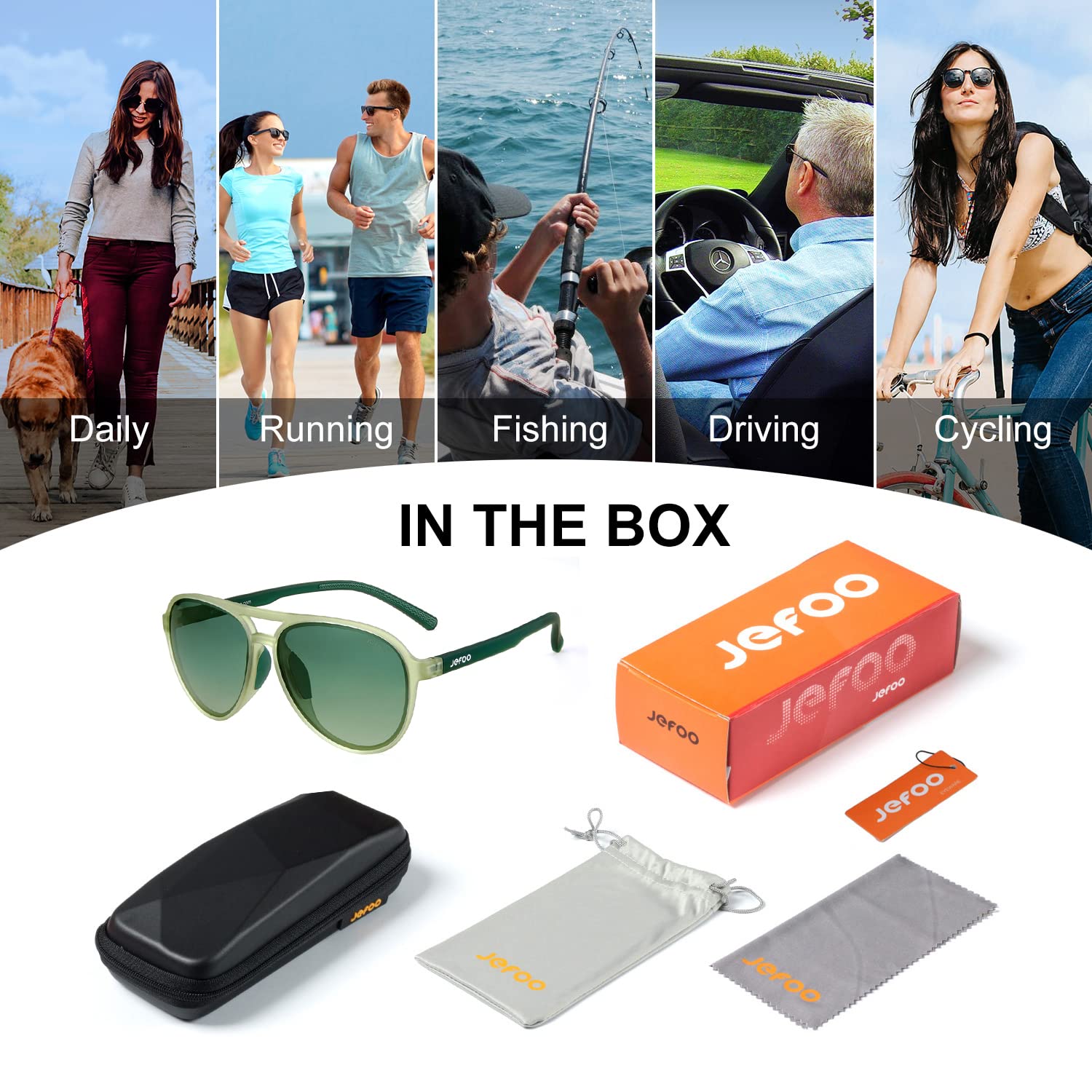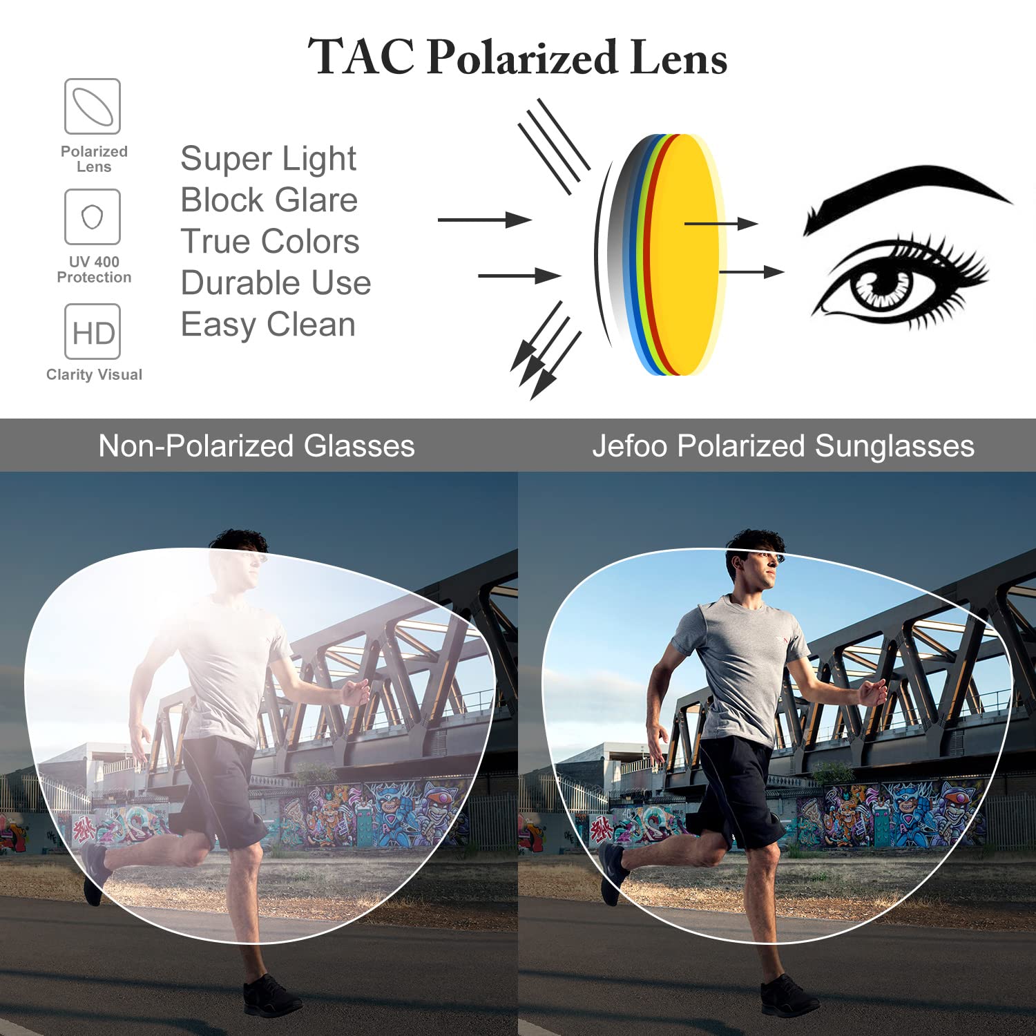 - POLARIZED & UV PROTECTION : Jefoo polarized UV protection glasses can not only reduce the glare produced by the reflection of the sun's rays, improve visual clarity and contrast, so that your eyes can relax even in the sun, but also protect your eyes from harmful solar UV rays. Whether you are driving to work or enjoying sunbathing outdoors, you can enjoy every detail of the world without worrying about the health of your eyes.