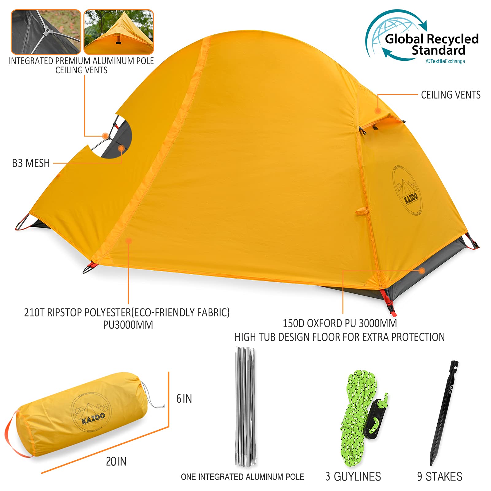 KAZOO Waterproof Backpacking Tent Ultralight 1 Person Lightweight Camping Tents 1 People Hiking Tents Aluminum Frame Double Layer (Eco-Friendly Fabric) (Bright Yellow)