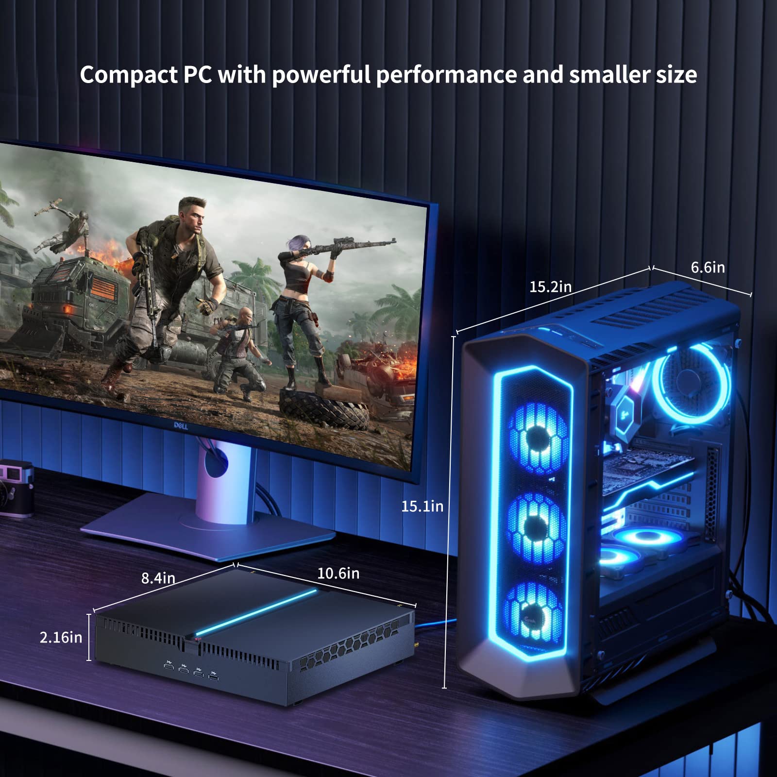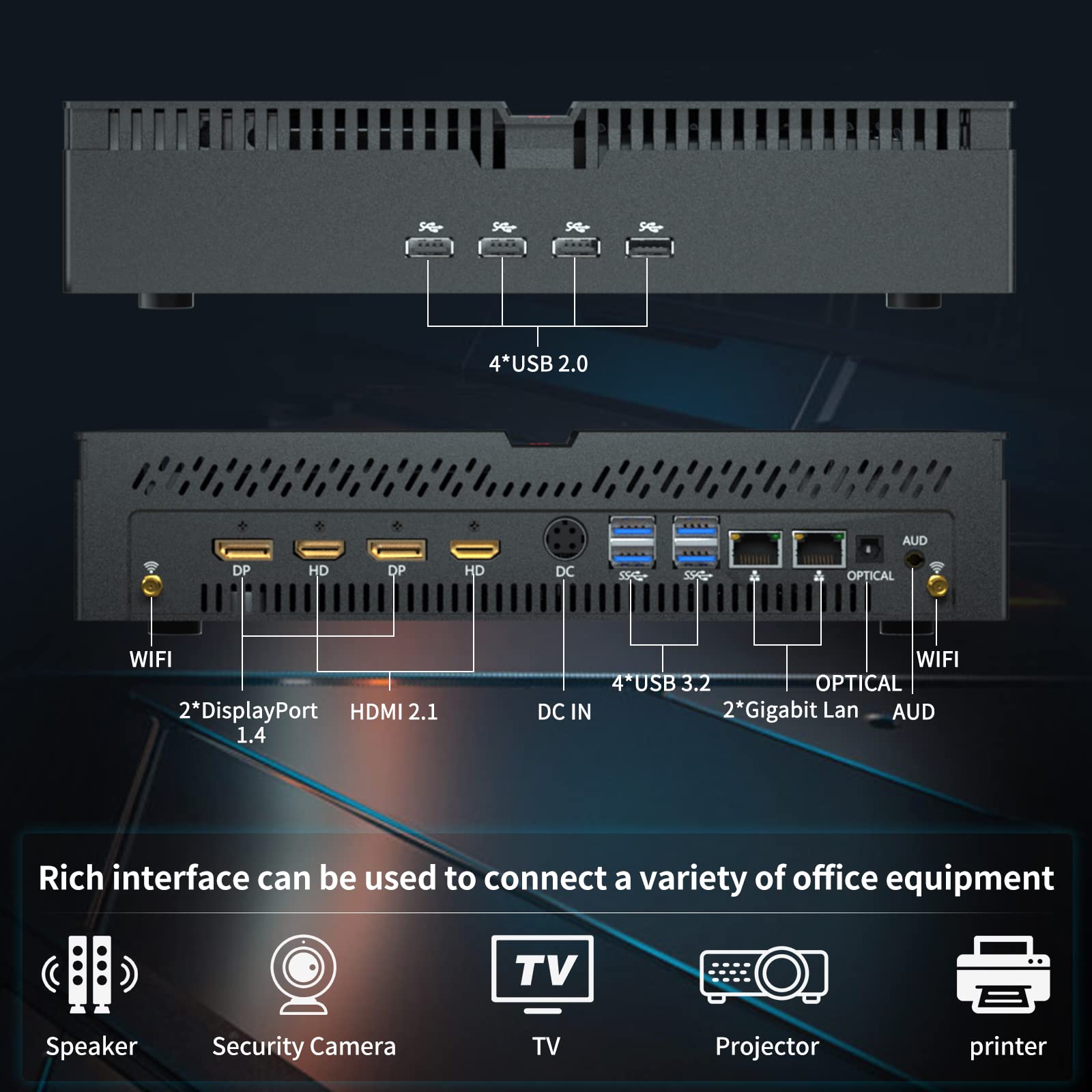 - [UHD Four-Display] Mini PC equipped with RTX3060 12G GDDR6 discrete graphics card, supporting ray tracing and AI cores. easy connect 4 monitors, 2 x HDMI 2.0 and 2 x DP1.4 ports(All Support 8K@60Hz display), It can provide you with a first-class gaming experience and realistic picture quality. It can be used for various applications such as office, bussiness, gaming, design, video wall systems, professional AV systems, and security fields.