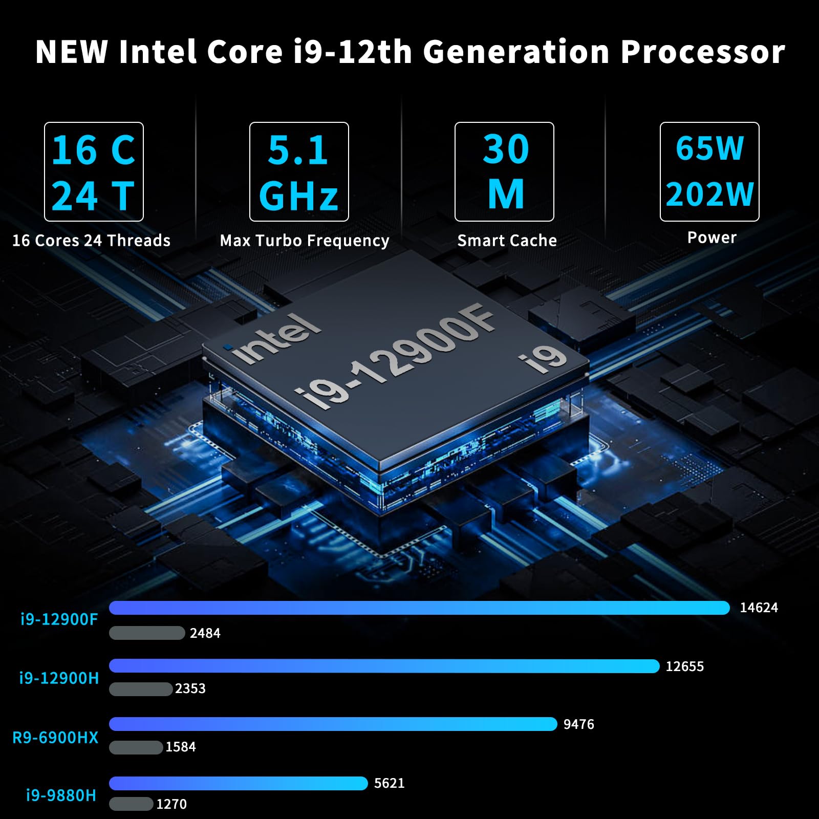 - [Powerful System] Mini Gaming PC equipped with high-end Core i9-12900F, 16 Cores 24 Threads, 30M Cache, Base Frequency: 2.4GHz(up to 5.1GHz), 64GB DDR5 RAM| 2TB M.2 NVME PCIE4.0 SSD, Preinstalled with Windows 11 pro(64 Bit), it boasts faster response speed and multi-threaded sensitive response, Whether you’re rendering complex 3D scenes, design work, editing 4K video, or Gaming livestreaming with the best encoding and image quality, GeForce RTX GPUs give you the performance to create your best.