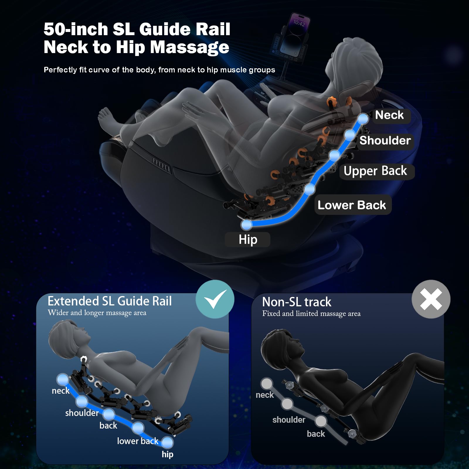 - ๐ญ๐ฒ๐ฟ๐ผ ๐๐ฟ๐ฎ๐๐ถ๐๐ + ๐ณ ๐ ๐ฎ๐๐๐ฎ๐ด๐ฒ ๐ง๐ฒ๐ฐ๐ต๐ป๐ถ๐พ๐๐ฒ๐ - With a 50-inch SL track, this massage chair delivers 7 different massage techniques: airbag compression, shiatsu, tapping, tuina/scraping, kneading, percussion, and Thai stretching. It provides complete relaxation that stretches from your hips to your neck. The zero gravity mode also improves the quality of the massage in general. Our massage chair's adjustable recline adjustment feature accommodates a variety of user demands. It's possible that your wishes will be fulfilled, whether you wish to watch TV on the massage chair or take a little nap while getting a massage