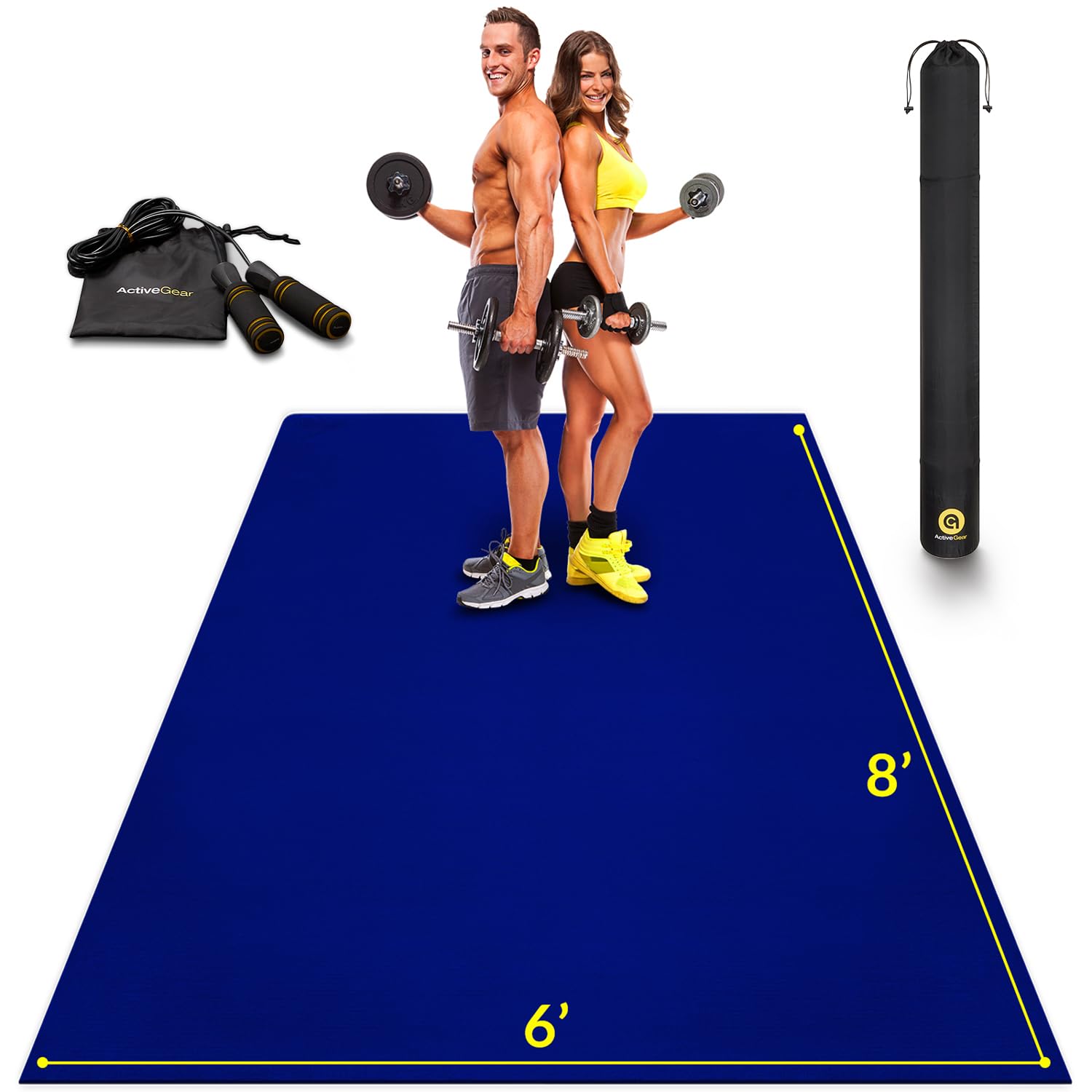 Large Exercise Mat 8' x 6' x 7mm | Ultra-Durable Non-Slip Rubber Workout Mat for Home Gym Flooring | Ideal for Cardio, Fitness, Plyo, MMA and Yoga | Jump Rope and Storage Bag Included - Blue