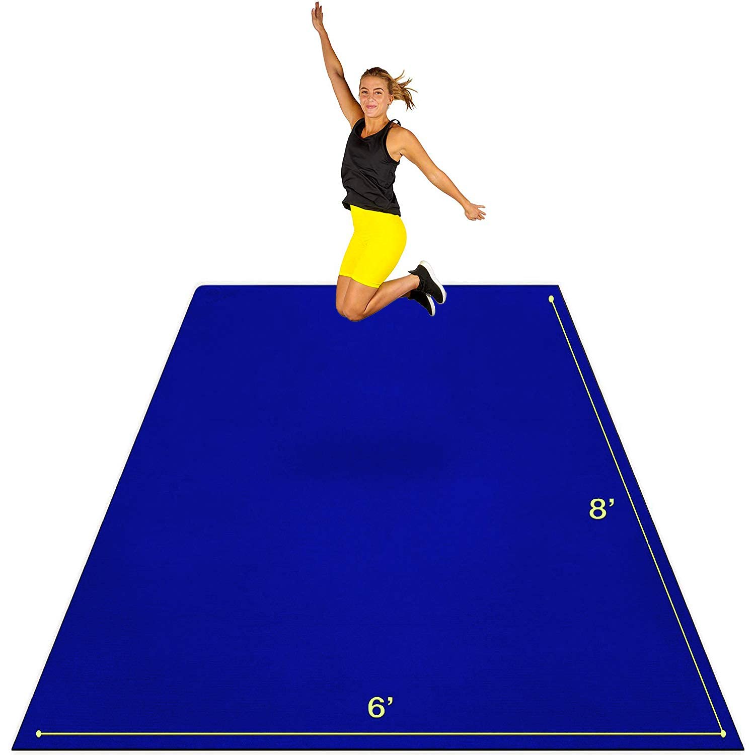 - Your Home Gym Anywhere - Easy to store, easy to use, and twice the size of a standard yoga mat, this 8' x 6' gym mat works great on all floor surfaces including tile, concrete and carpet in your living room, basement, garage and outdoors.