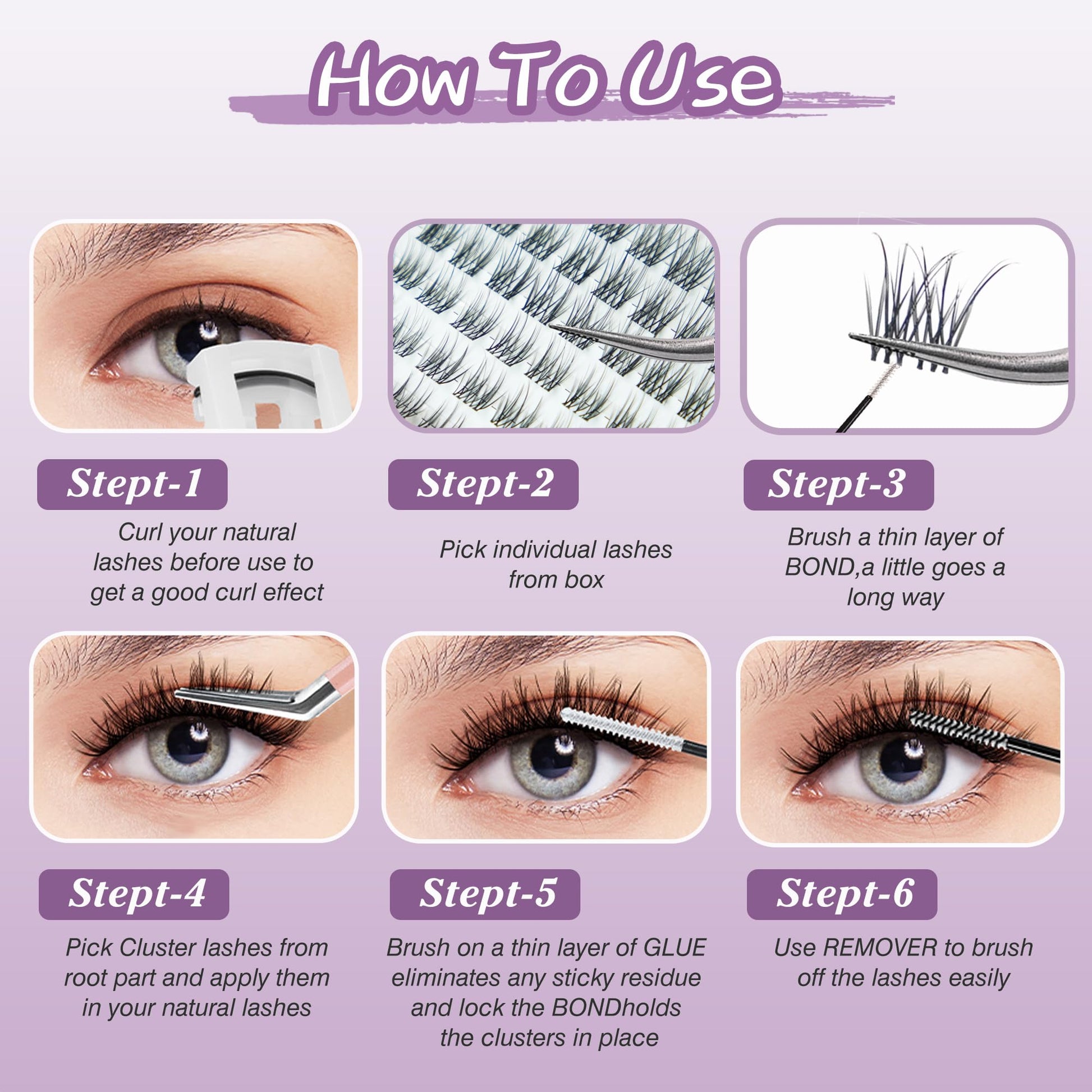 - ✨ 1. Easy to Use & Remove – Beginner-Friendly Lash Clusters Kit Our lash clusters kit is perfect for beginners! The individual lash clusters are easy to pick up with the included lash tweezers. The bond & seal ensures long-lasting wear yet removes effortlessly without damaging natural lashes.