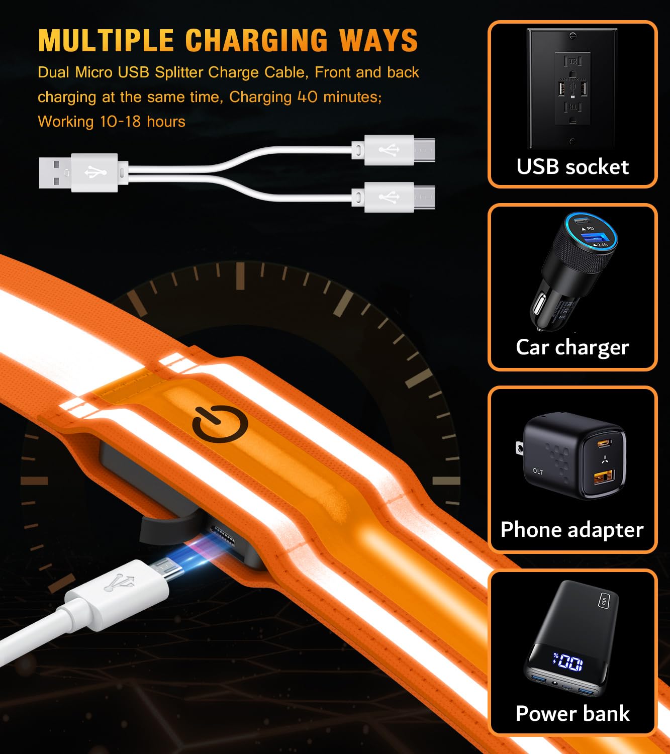 - 🏃 USB Rechargeable - LED reflective belt with USB charging cable suiting various USB ports. Upgraded battery with shorter charging time, longer battery life, and sustained use for 10 to 48 hours when fully charged.