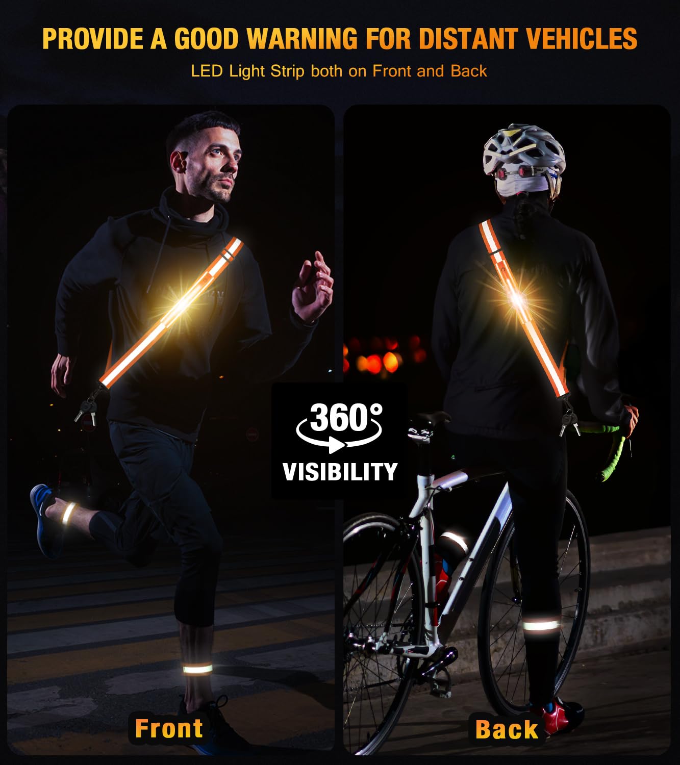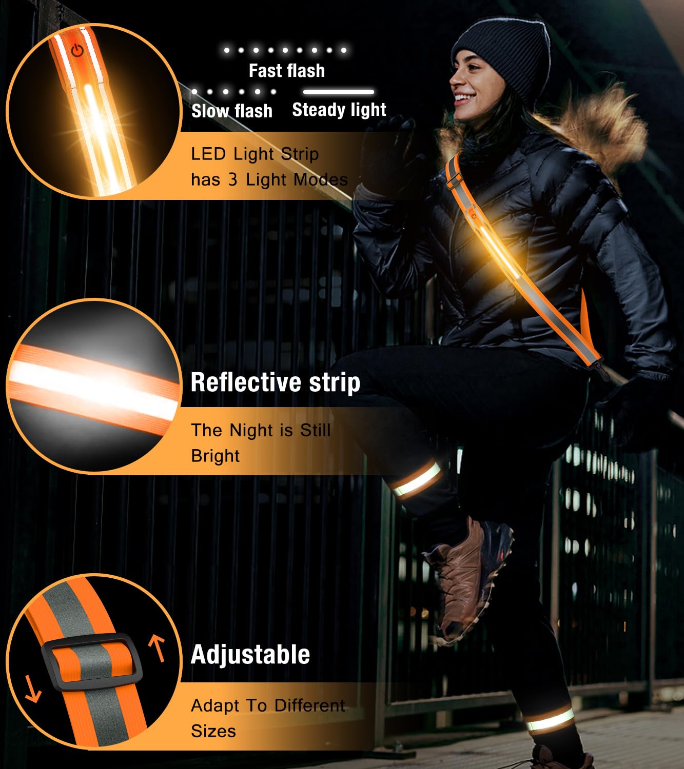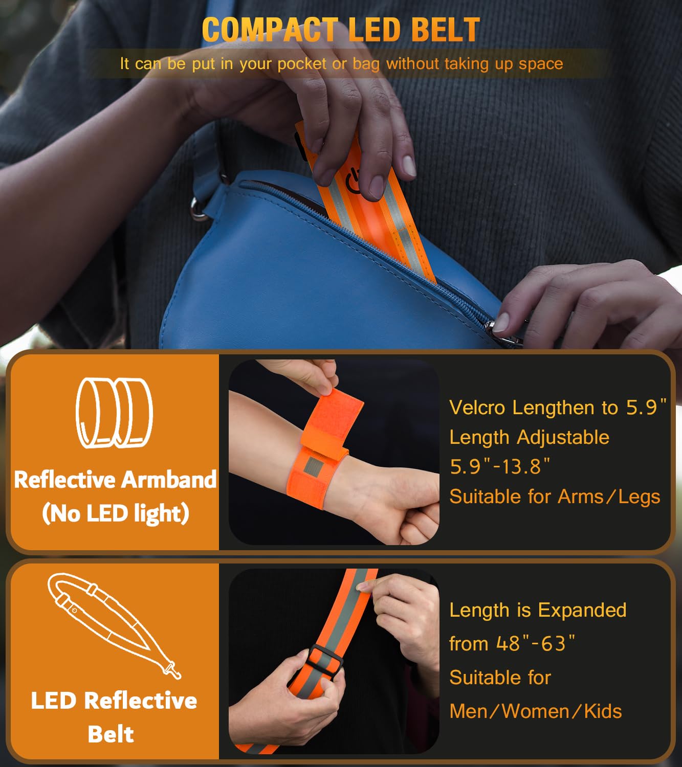- 🏃 High Visibility - Reflective running gear equipped with LED belt, reflective sash and reflective Armband. These can provides 360°reflectivity and visibility, making you visible 1000 feet far away. Prevent you and your family away from accidents in the dark.