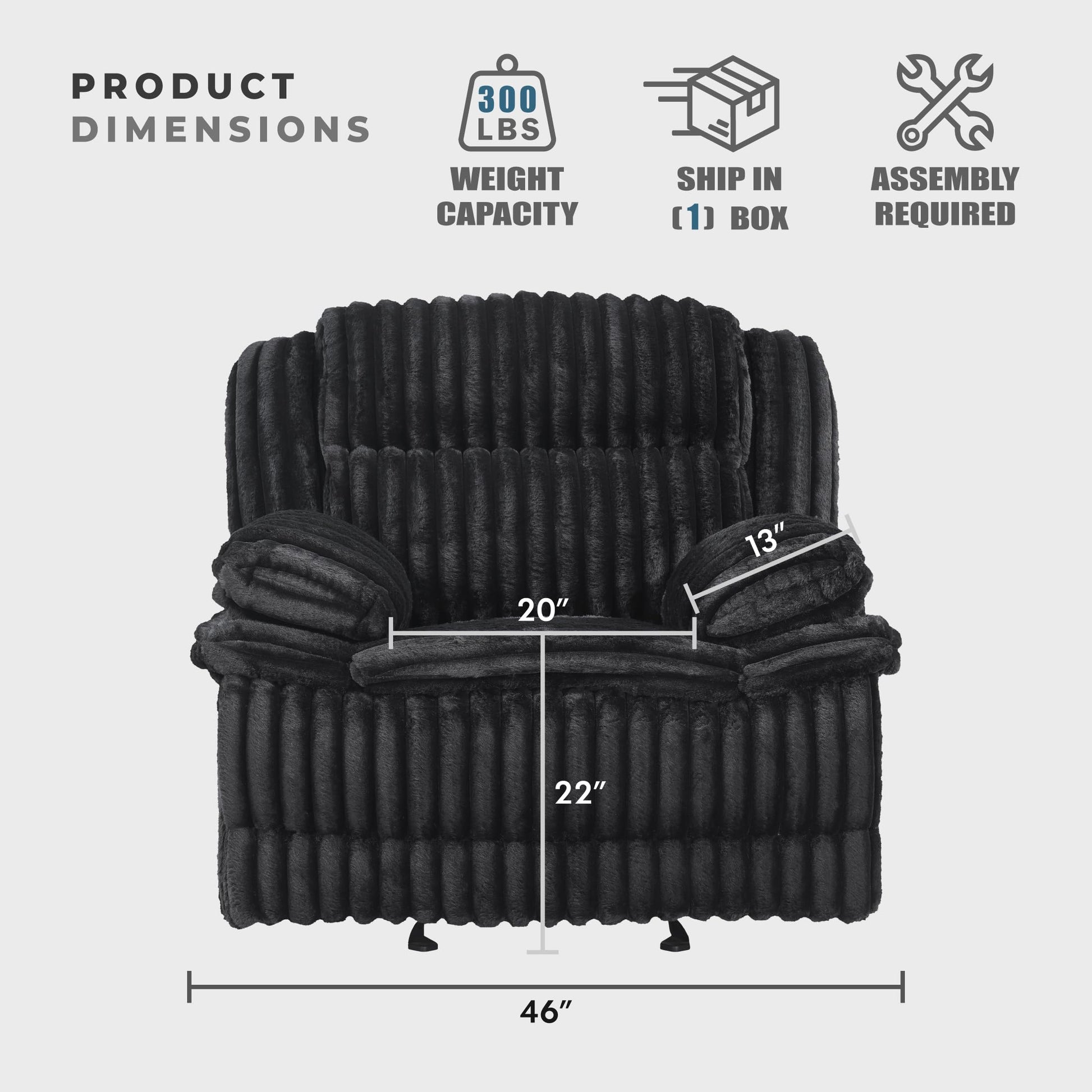 - [Perfect Dimensions] Measuring 46'W x 40'D x 40'H; Seat Size: 20' x 22.5' x 22'; Arm Width: 13'; Arm Height: 27.5'; Fully Reclined Length: 64'; Fully Reclined Height: 32'; Required Back Clearance: 11'; Doorway Width: 27.5'. Weight capacity up to 300lbs
