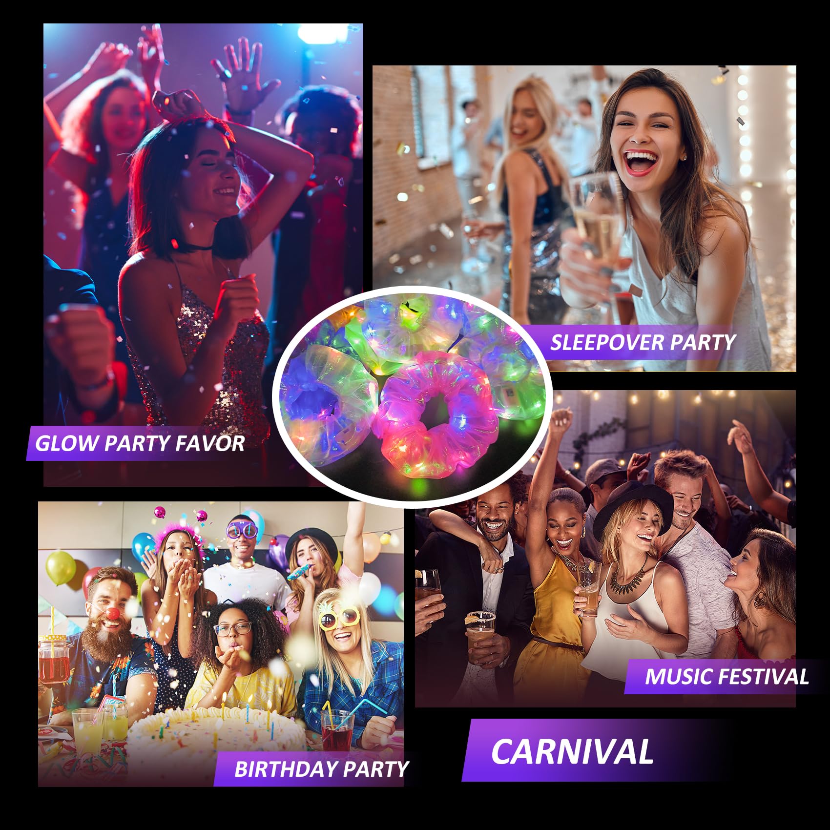 - Be the Star of the Party: Our glow-in-the-dark scrunchies bring a distinctive and captivating flair to your hairstyle, making them the ideal choice for a variety of festive occasions. Whether it's Halloween, Christmas, neon-themed parties, costume bashes, carnivals, rave gatherings, dance nights, or a lively evening out, our light up scrunchies are the perfect party favor to ensure you shine bright and stand out from the crowd