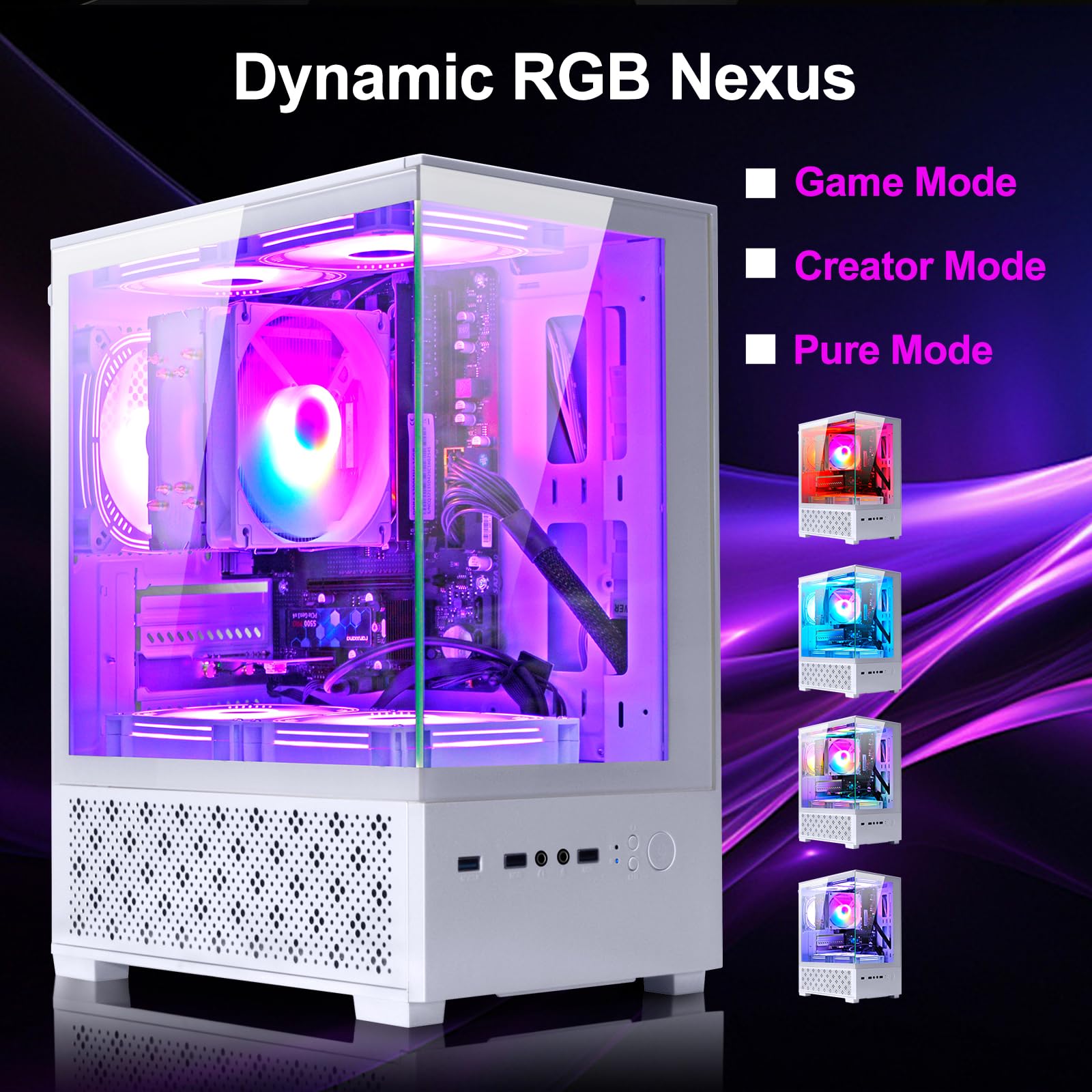 - Design & Extras: The PC is equipped with 5× RGB fans and lighting effects. These lights can be set according to the user's preference, adding a splash of colour to the PC and enhancing the overall visual effect. The chassis is designed with glass panel on three sides, which allows users to visualise the internal hardware layout and lighting effects. At the same time, the glass side panels also ensure good heat dissipation performance, ensuring that the hardware remains stable under prolonged operation Applicable Scenarios.