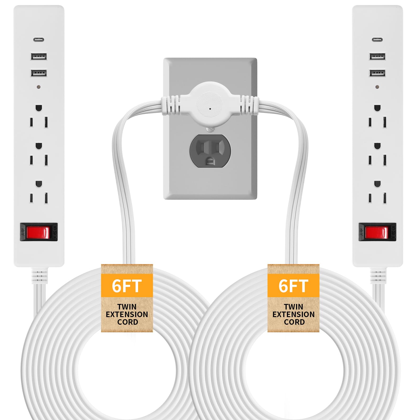 Makevivi Twin Extension Cord - 12 FT Split Extension Cord, 6 Outlets and 6 USB Ports - Double Power Strip, 3 Prong and Flat Plug, for Behind Bed, Couch, Nightstands, Vanity, Furniture