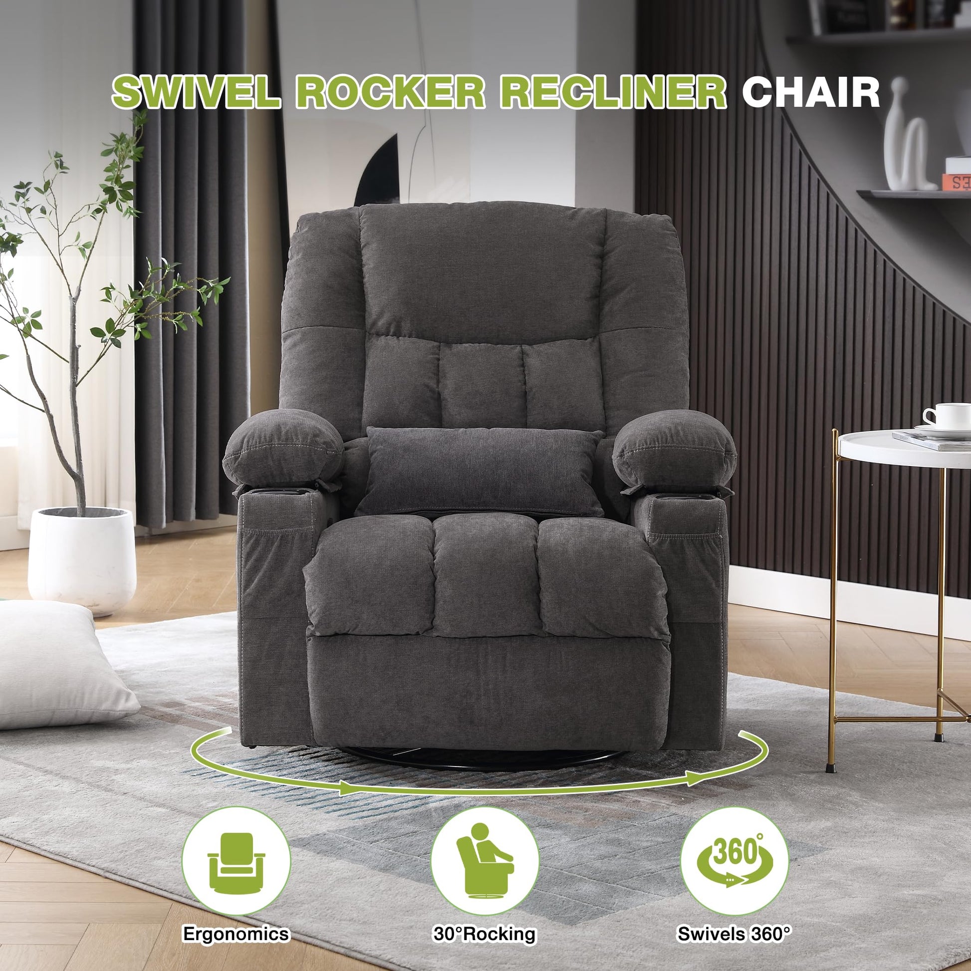 - ๐๐๐ป๐ฎ๐บ๐ถ๐ฐ ๐ฏ๐ฒ๐ฌยฐ ๐ฆ๐๐ถ๐๐ฒ๐น & ๐ฅ๐ผ๐ฐ๐ธ๐ถ๐ป๐ด ๐๐๐ป๐ฐ๐๐ถ๐ผ๐ป: Enjoy the full 360ยฐ rotation and 30ยฐ natural rocking motion of this swivel recliner chair. Its dynamic design ensures you can adjust your view and relax from any angle, making it the best recliner chair for living room comfort. This chair is perfect for enhancing your lifestyle and relaxation.