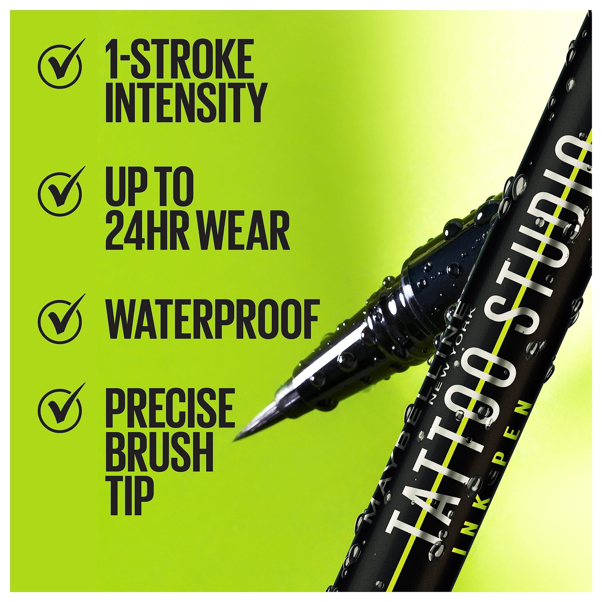- Meet Our Ink That Withstands It All: Maybelline Tattoo Studio Ink Pen Liquid Eyeliner is waterproof, fade resistant, smudge resistant and flake resistant. Black saturated pigments deliver intense impact with 1 stroke intensity and up to 24 hours of wear