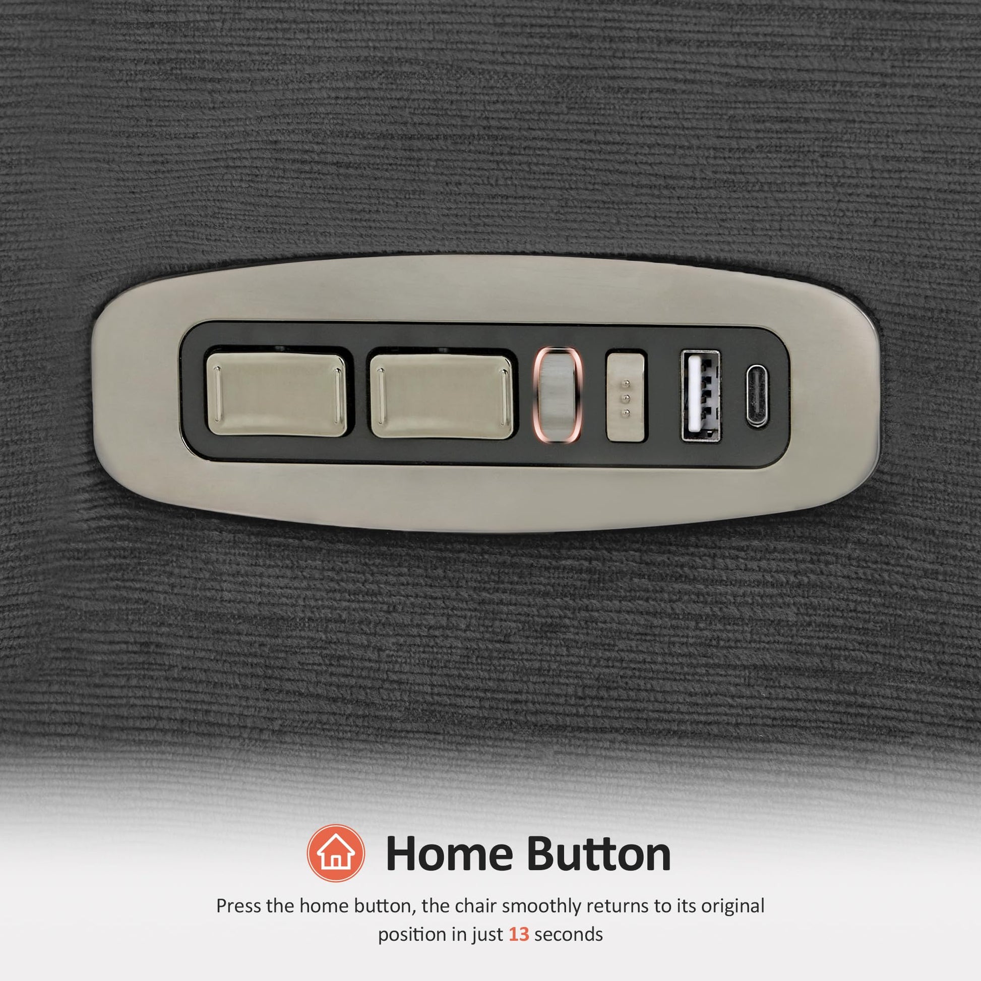 - ONE-TOUCH RESET & LED LIGHTING. Press the home button, and the chair smoothly returns to its original position in just 13 seconds. The dual USB &Type C ports on the armrest support any phone or pad, and LED lighting for added relaxation