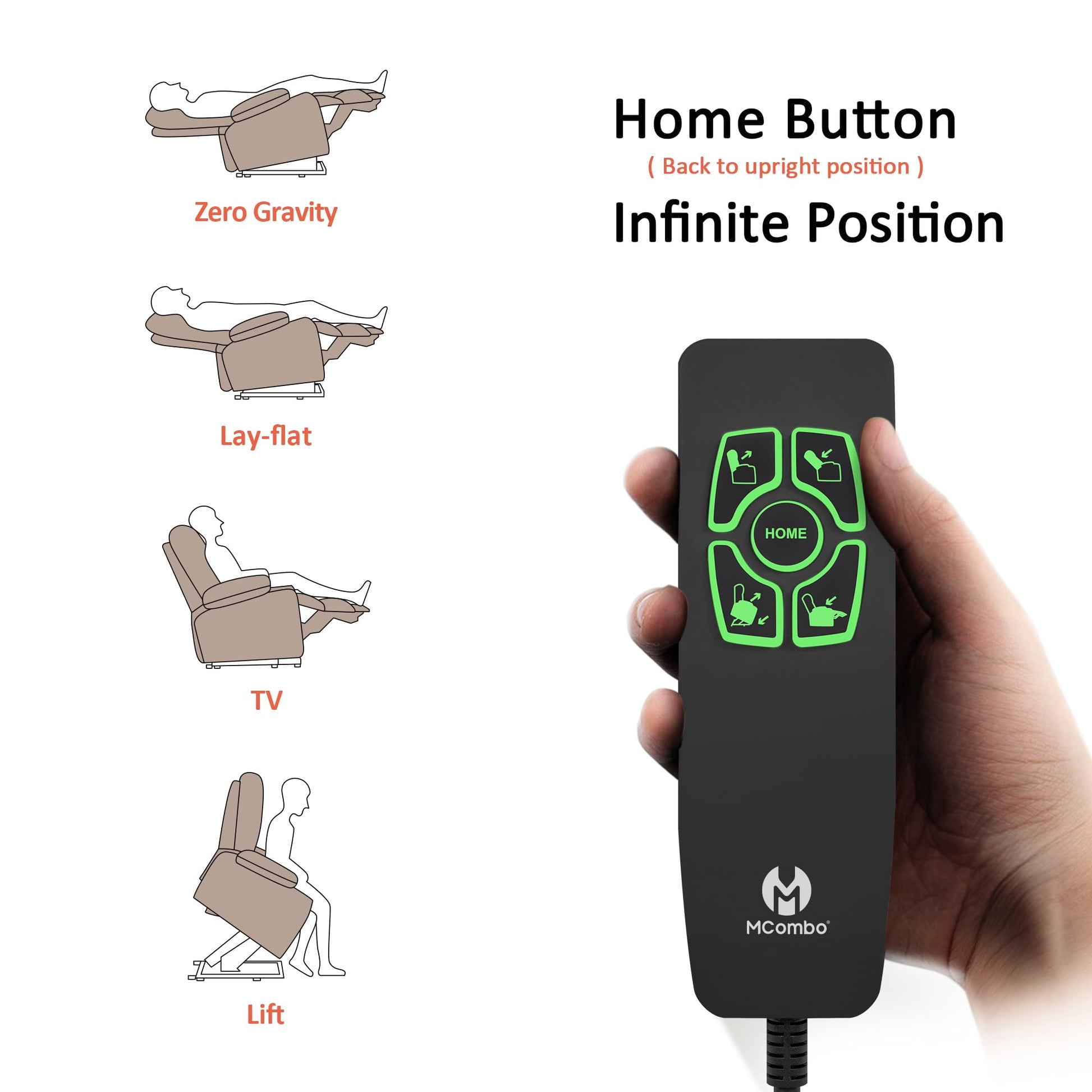 - Home Button: When someone knocks on the door, you only need to press the HOME button on the remote control and you will return to the upright position in a maximum of ''16'' seconds. When the reclining position is raised, the back will move first to ensure your safety