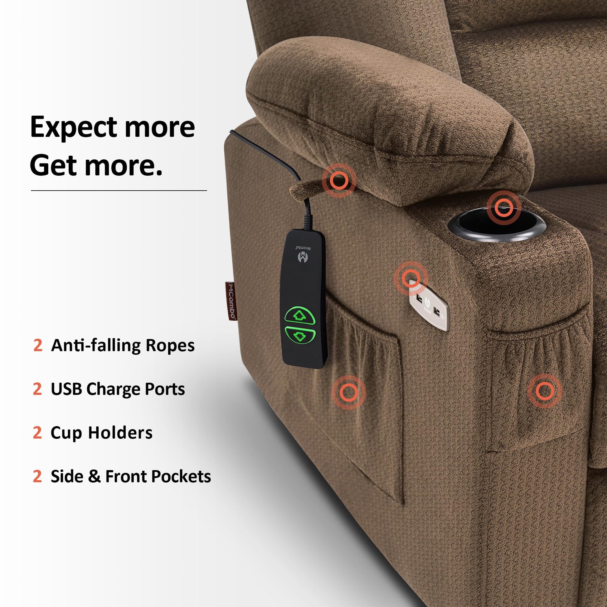MCombo Large Power Lift Recliner Chair Sofa with Massage and Heat for Big and Tall Elderly People, 3 Positions, Cup Holders, and USB Ports, Fabric 7549 (Large, Brown)