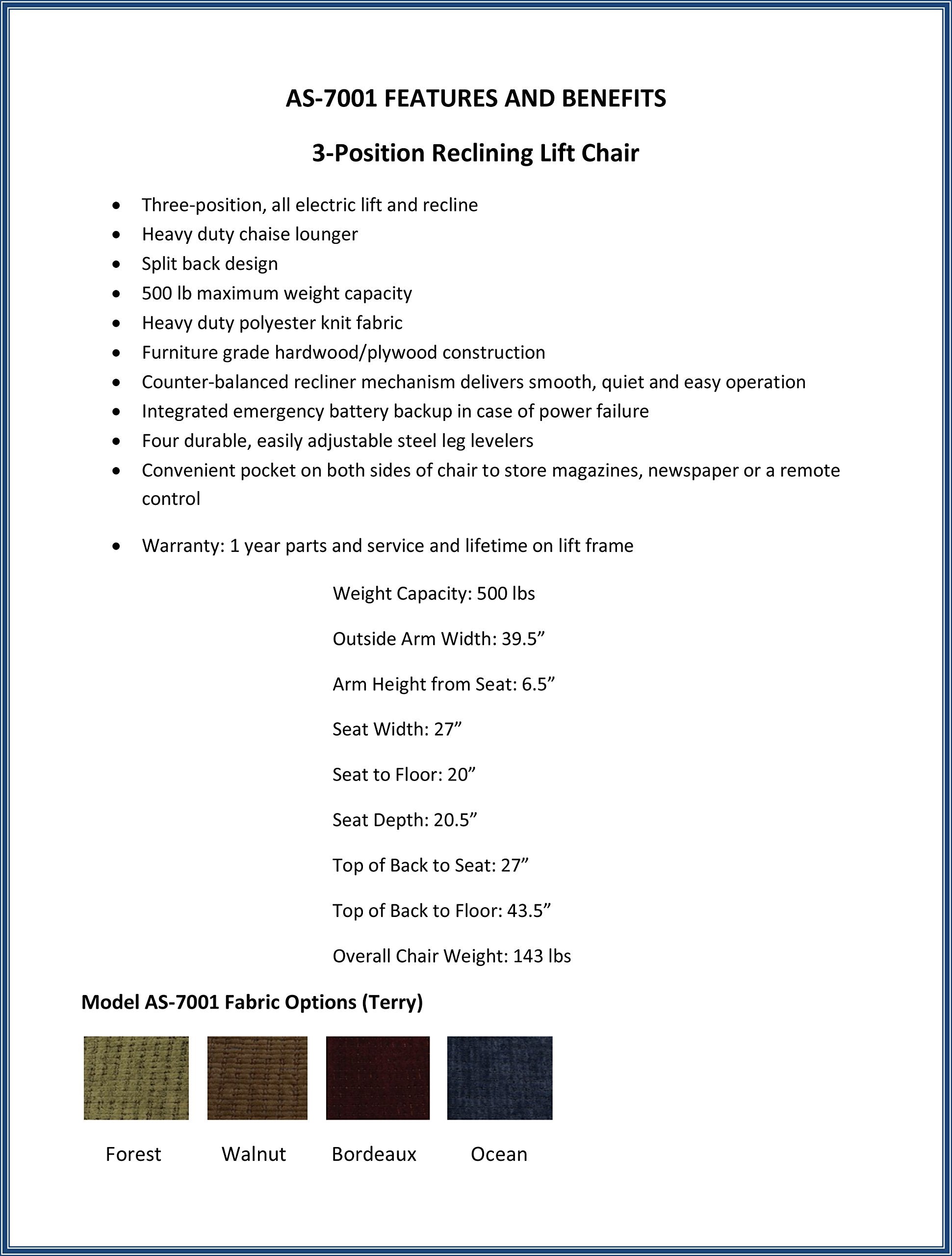 Details: The chair is ideal for watching television, reading, sleeping or to simply sit back and relax. If you or a loved one needs help sitting down or standing back up, our Easy Comfort recliners provide a perfect solution...as well as a sense of personal independence. With the touch of a button the chair gently rises or reclines. The electric motor provides a smooth transition from recline to a standing position, making it ideal for persons who have difficulty getting into or out of a chair. The Superior is a three position lift chair - closed, partial recline, and full recline. The Superior features a split back design and chaise seat for head to toe comfort. The power recline lets you recline automatically to any position.