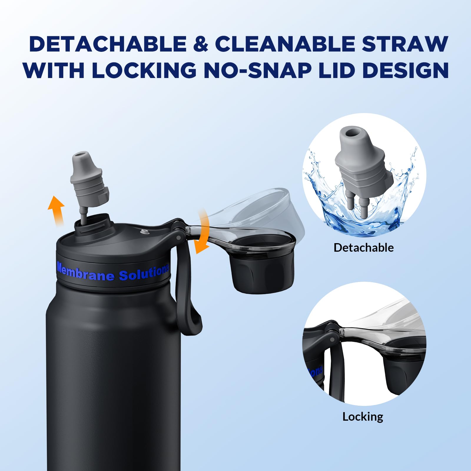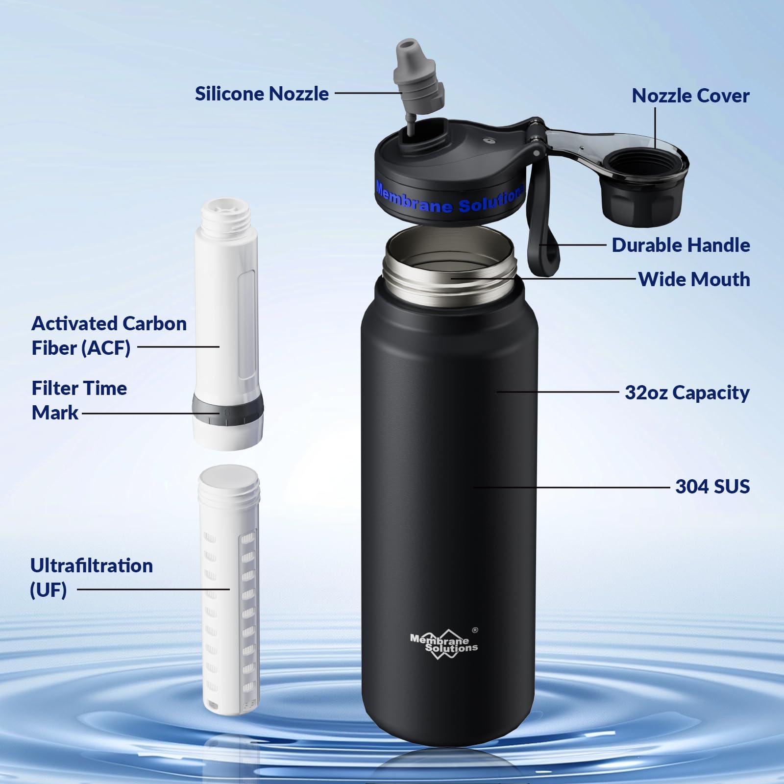 Membrane Solutions C3 Filtered Water Bottle, 32oz Stainless Steel Water Bottle with Replaceable ACF+UF Filter Cartridge, Portable Water Filter, Travel, Hiking & Camping for Drinking Water(Black)