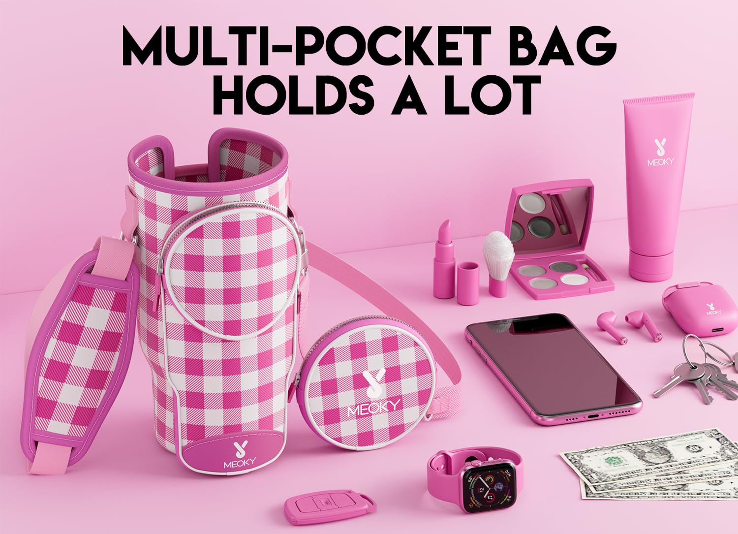 - MULTIPLE POCKETS. Meoky water bottle carrier bag comes with 3 zippered pockets, including 1 large phone pocket, 1 front pouch and 1 extra pocket for storing smartphones, cash, cards, keys, and more.