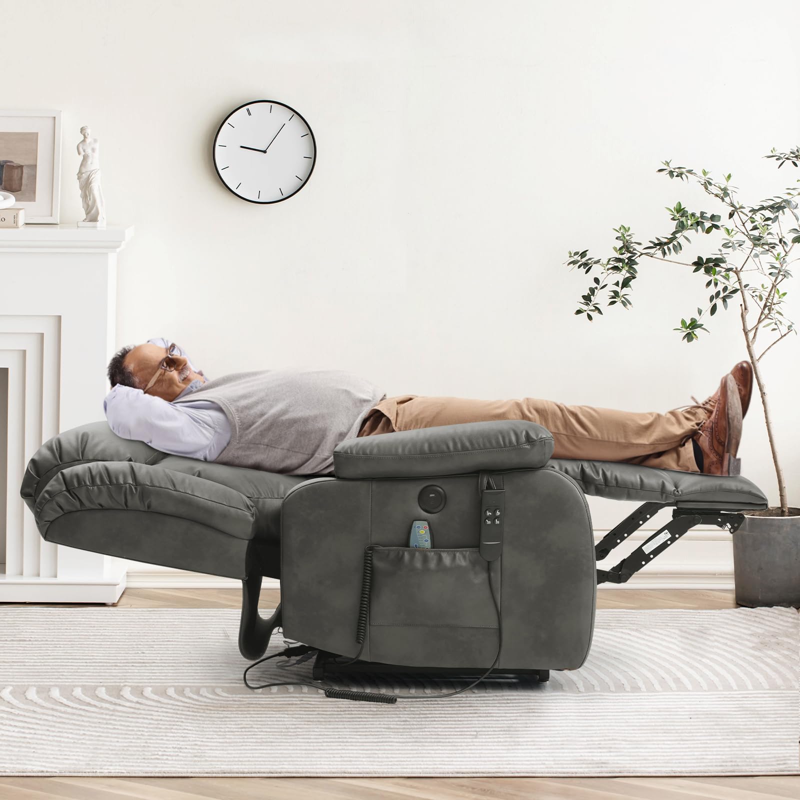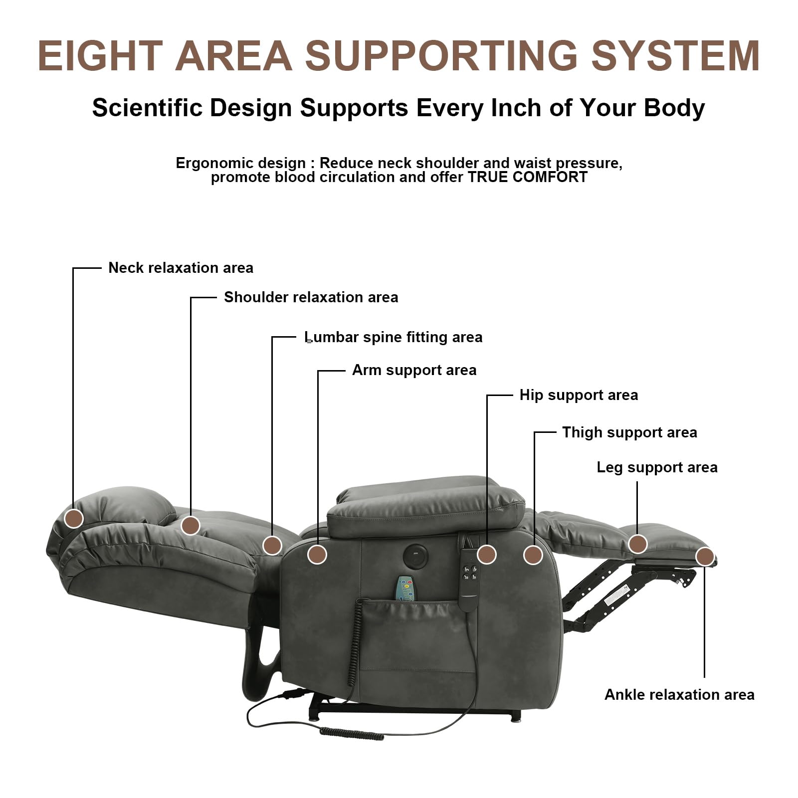 - 【Upgraded Heating & Massage】The electric lift recliner is designed with 5 adjustable massage modes (pulse, press, wave, auto, and normal), 8 vibrating nodes (back, lumbar, thigh, and leg)*2, 3 intensity options (high, mid, and low),and 3 timing options (15m,30m,60m),meeting all your massage needs.You can enjoy a personalized full-body massage experience in the comfort of your own home. The lumbar heating function helps alleviate fatigue by reducing pressure and enhancing blood circulation in the lumbar.