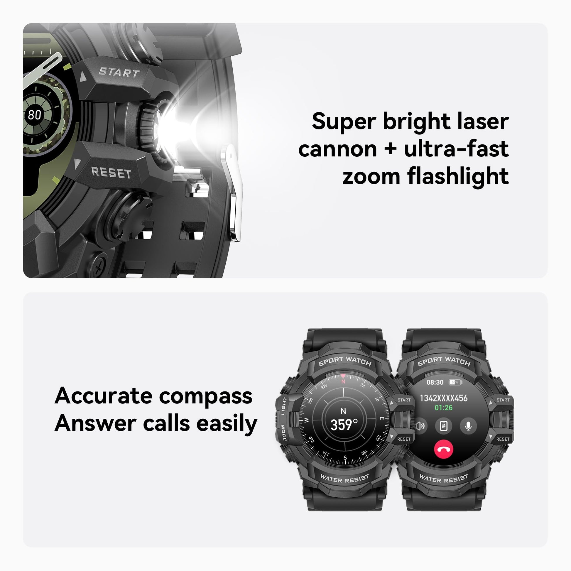 - ⌚️【Laser cannon & Flashlight】Equipped with a Super bright laser cannon and ultra-fast zoom flashlight, our outdoor sports watch is perfect for any adventure. Providing clear visibility and bright light. At the same time, SOS mode and warning mode can be activated in crisis situations