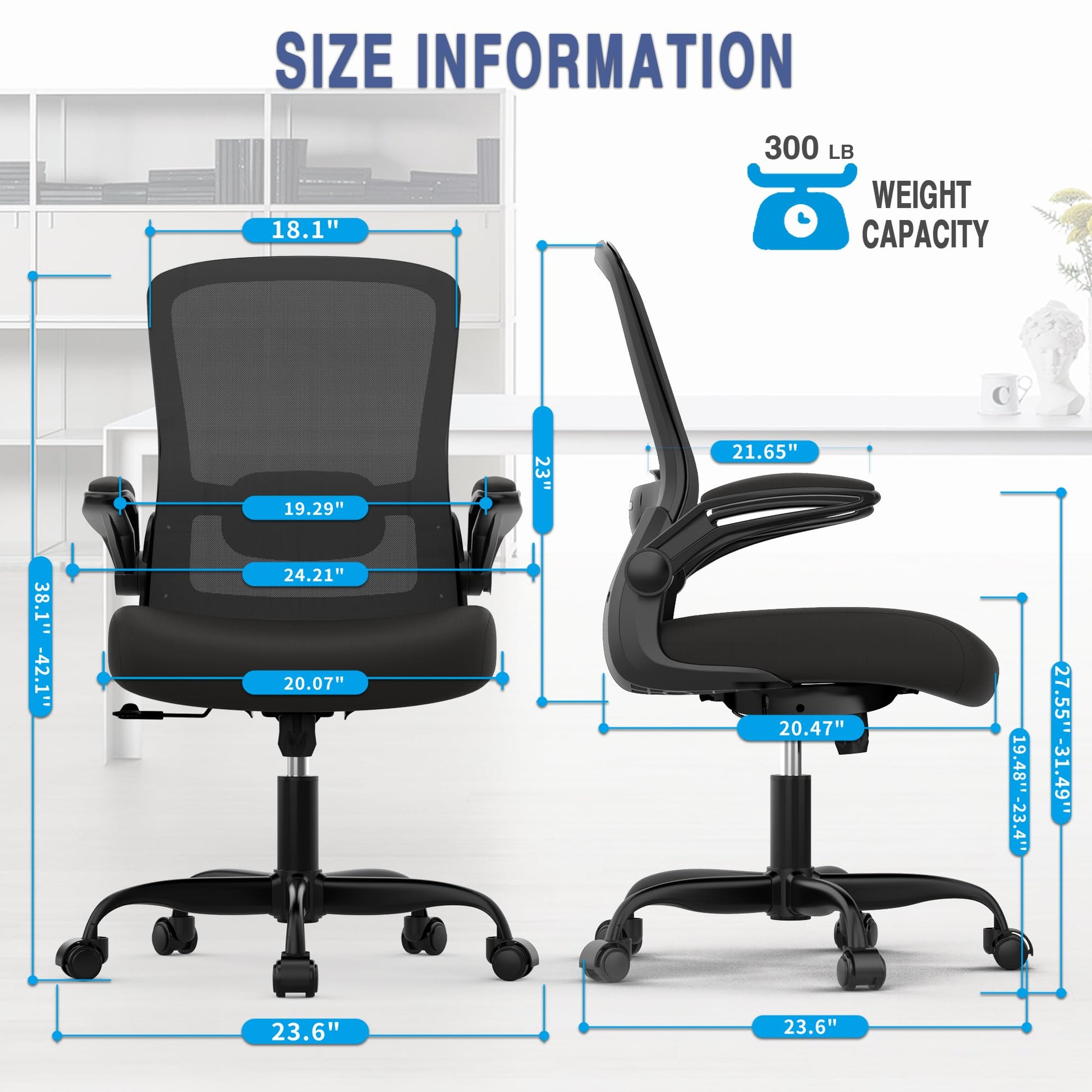 - 【ADJUSTABLE DESK CHAIR--More Comfort】This task chair has a 4 inch lifting range to meet the needs of people of different heights, it also has a reclining function of 90-135 °which allows you to relax yourselves after work. This mesh computer chair with flip-up armrest and seat height adjustable means you can find the perfect position to ensure you a pain-free day for long hour sitting.