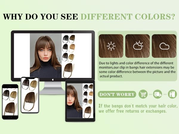 - ☘ Color Choice: Due to differences in environment, monitors, and lighting, bangs colors may vary slightly. To accurately present the actual colors of the product, we use camera equipment under natural light for photography