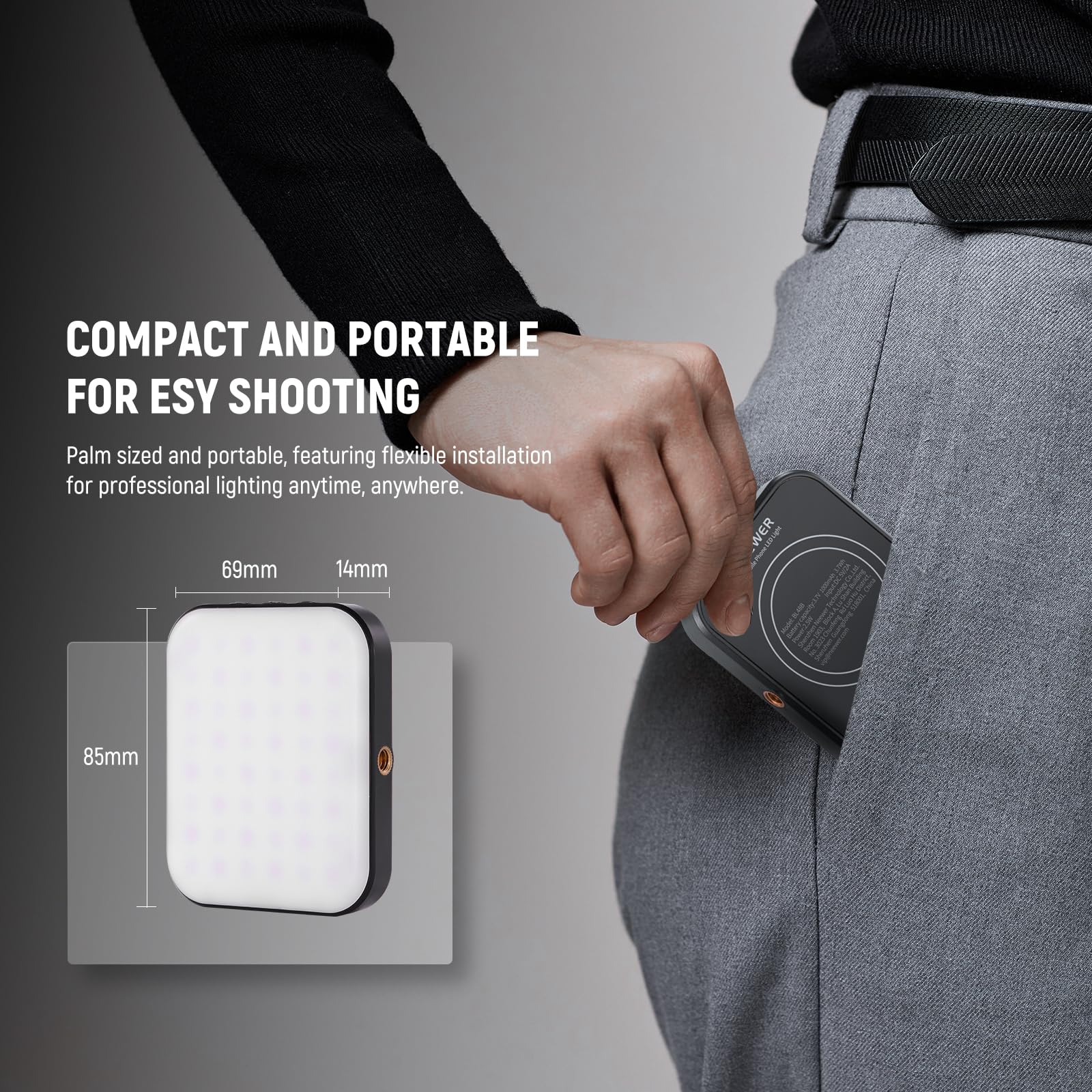 - 【Portable Mini Selfie Light for Outdoor Shooting】 This portable LED fill light for phone photography measures just 3.34'x2.72'x0.55' (85x69x14mm), compact and lightweight, not weighing you down when attached to your phone. It easily slips into your pocket for effortless transport, making a helpful companion for capturing moments and recording videos anywhere you need fill lighting