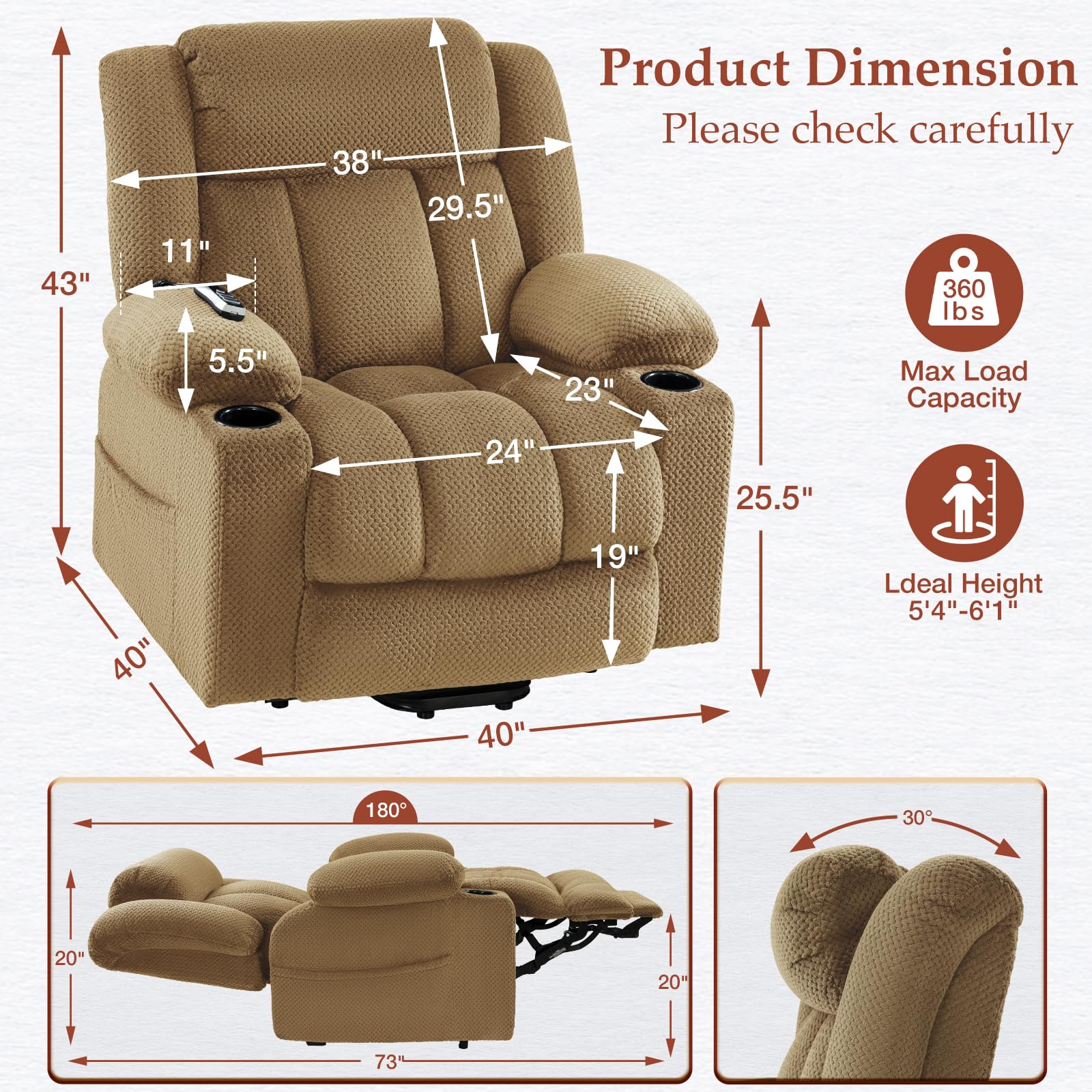 - Large Size for Big and Tall - Our power recliner chair suitable for big and tall 5'4”-6'1”, extended footrests to fully support your feet, prevent from dangling. The cushion 23'x24', providing ample space and comfort