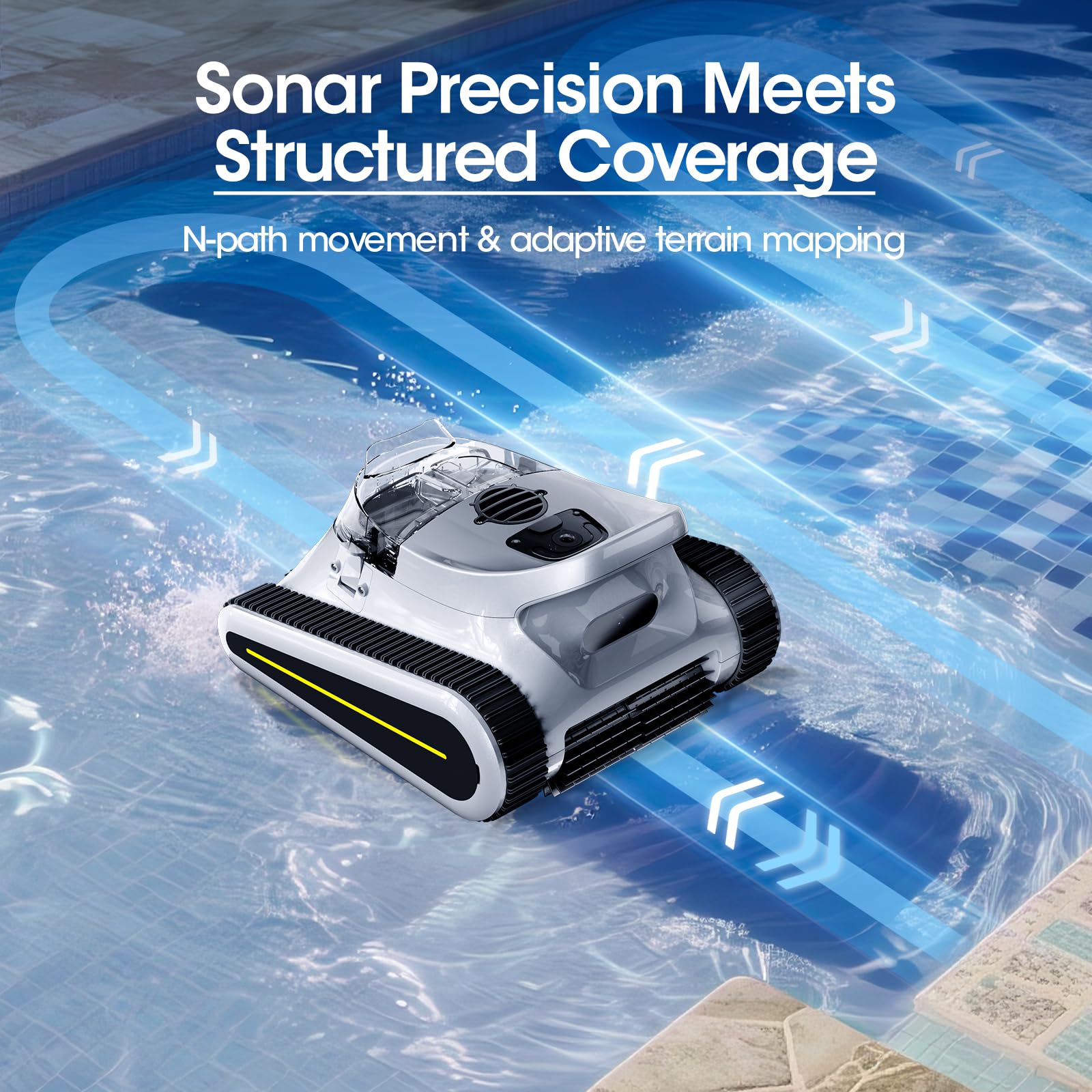 - 【Intelligent Mapping with Sonar Guidance】Engineered with integrated sonar mapping, SAT30 Turbo pool vacuum systematically scans and navigates your pool, ensuring comprehensive coverage with minimized overlap. The smart auto-docking function returns the robot to the edge upon cycle completion — efficient, elegant, and effortless.