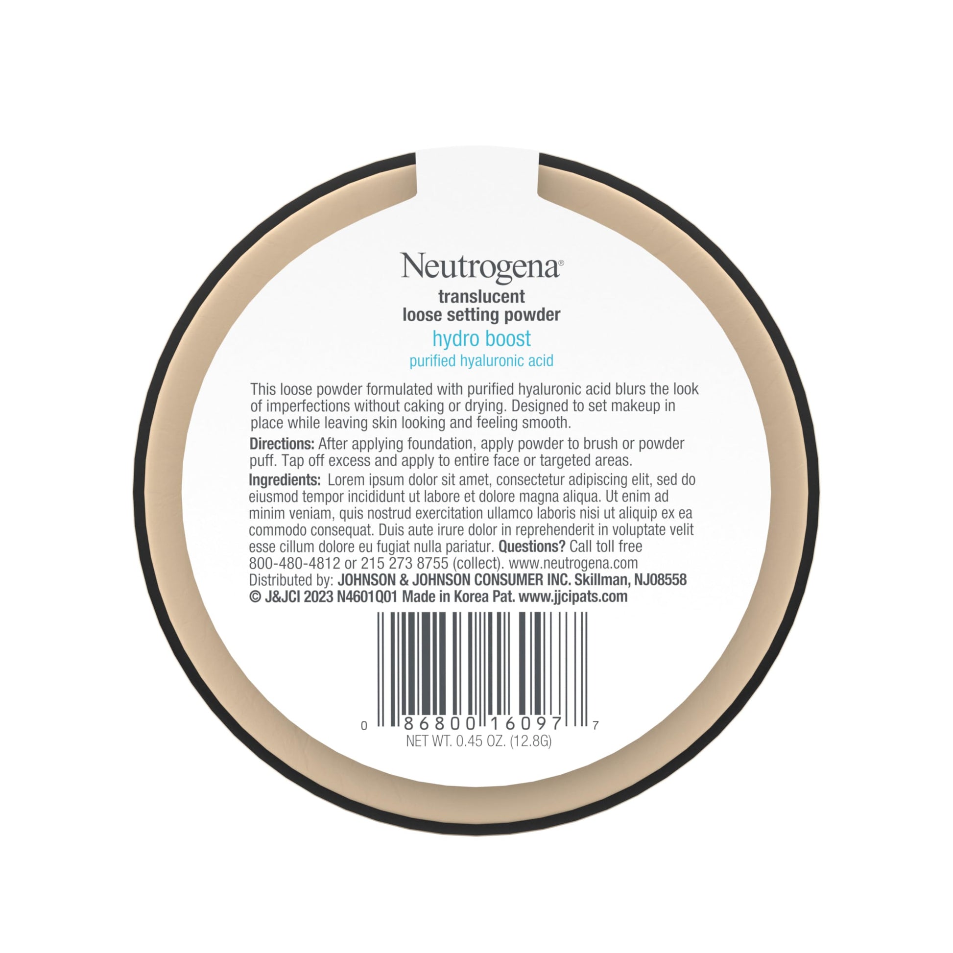 - Neutrogena Hydro Boost Translucent Loose Setting Powder with purified hyaluronic acid blurs the look of imperfections without caking or drying out skin
