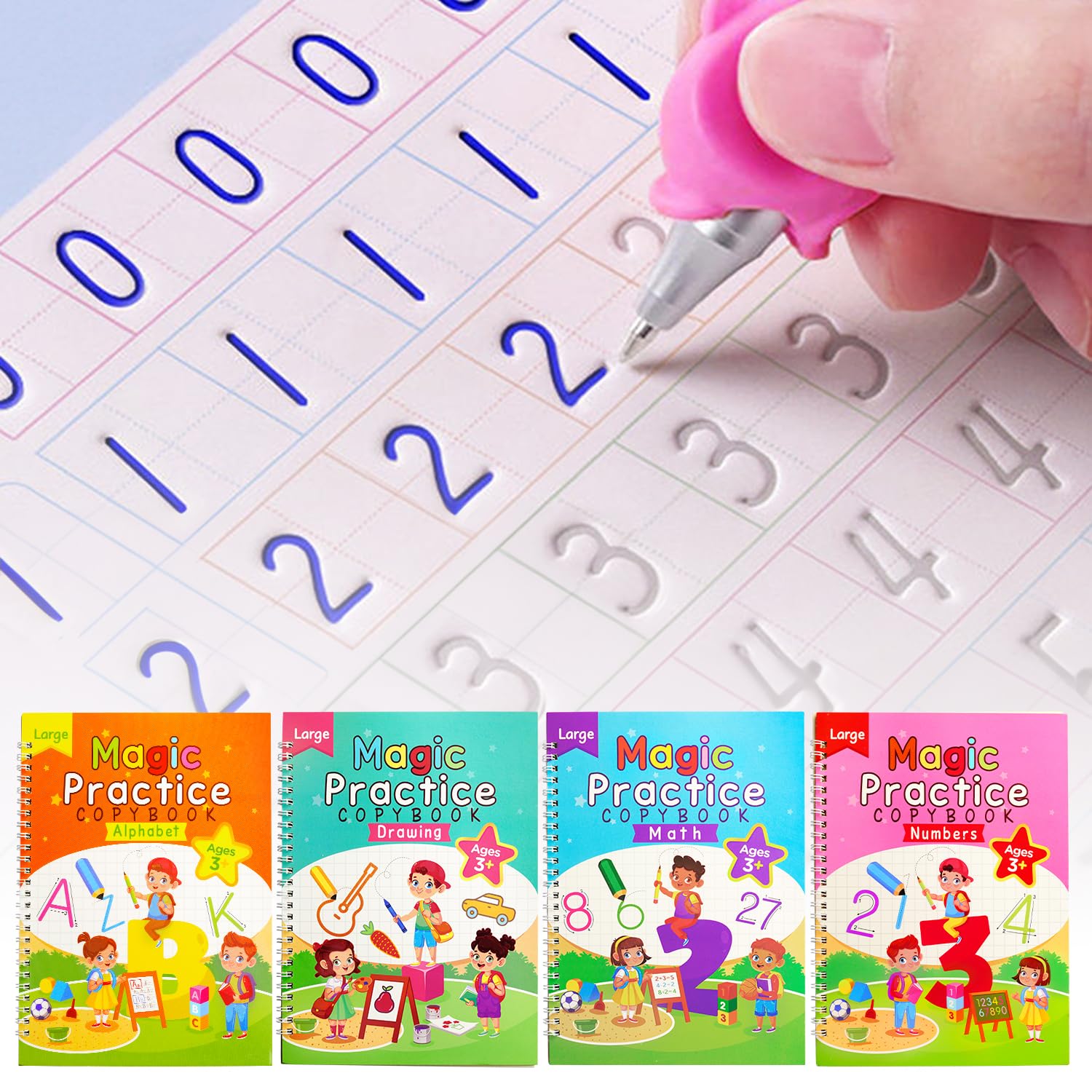 - This set of grooved letter tracing books for kids are much larger than other copybooks in the market. The package includes 4 Magic Practice Copybooks (Math, Numbers, Alphabet & Drawing) 2 pens + 2 pen holding aids + 10 refills.