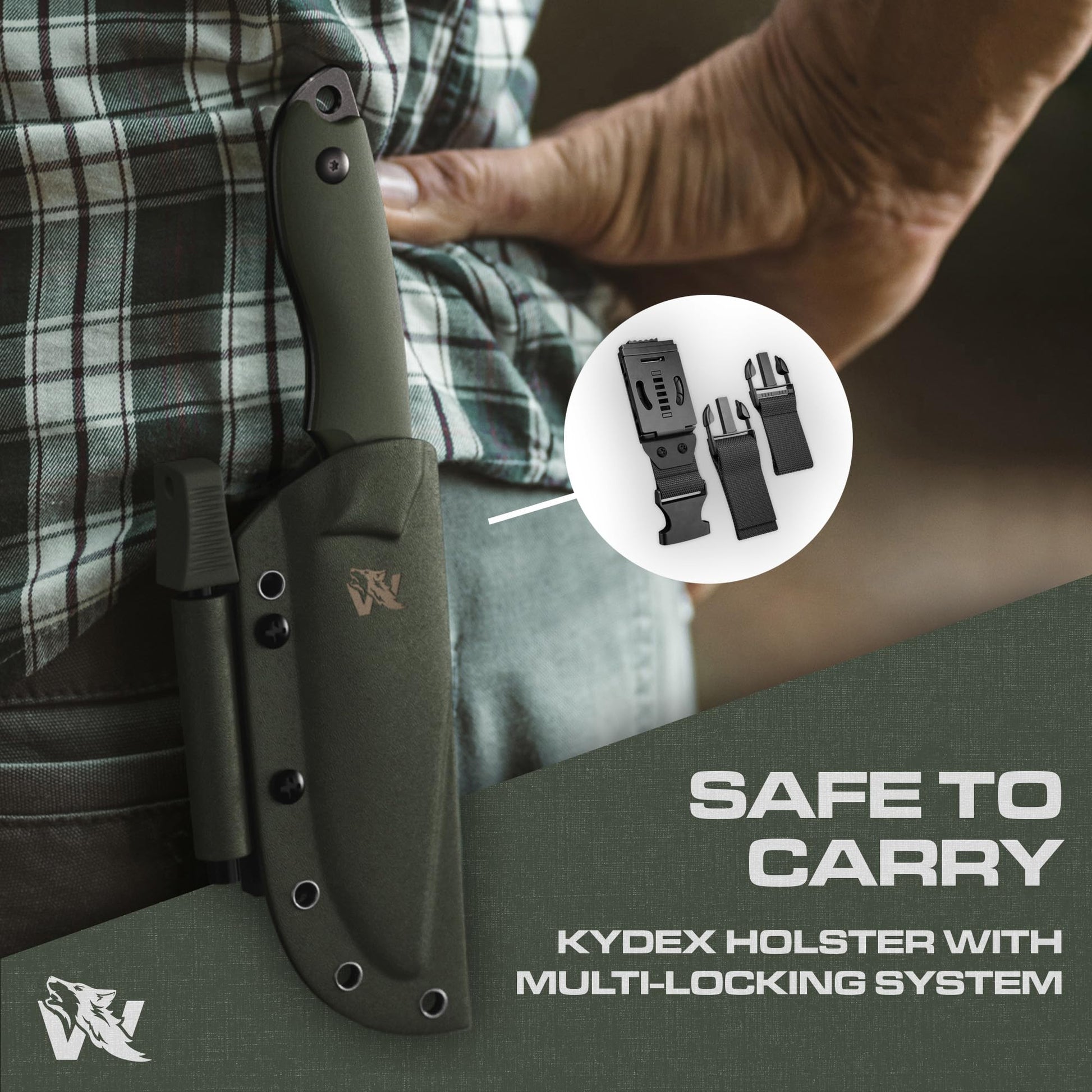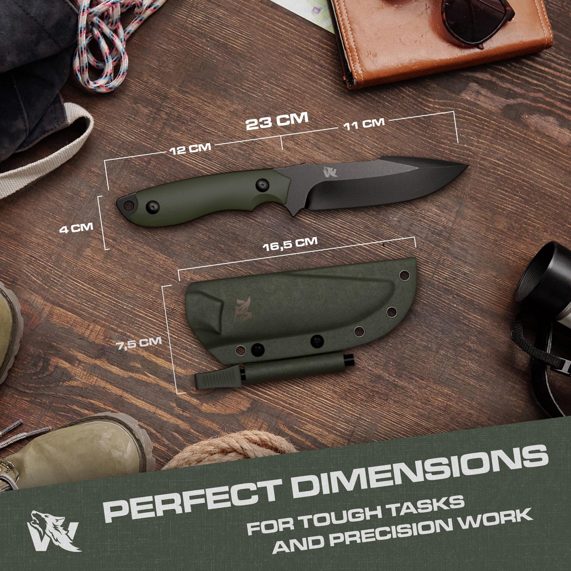 ODENWOLF AMBULO Fixed Blade Survival Knife with Kydex Sheath and Fire Starter - Bushcraft Knife Full Tang - Made of strong D2 Steel - Hunting Knife with Belt Loop and G10 Handle - Full Tang Knife